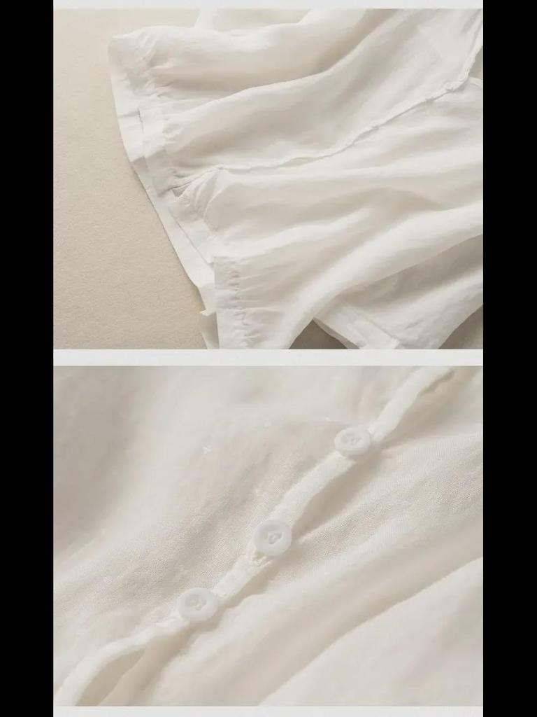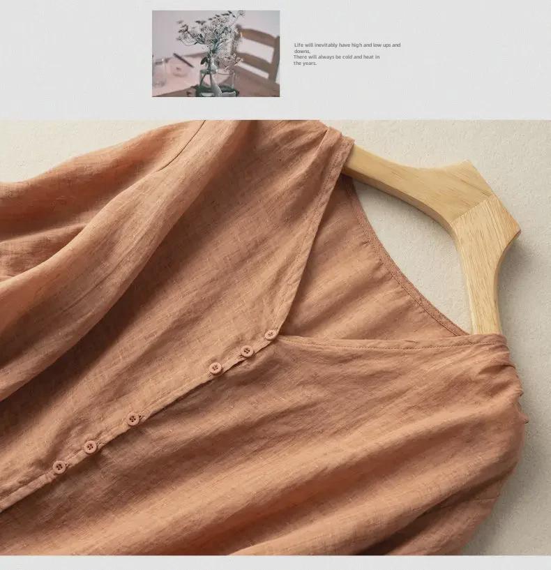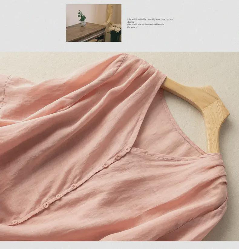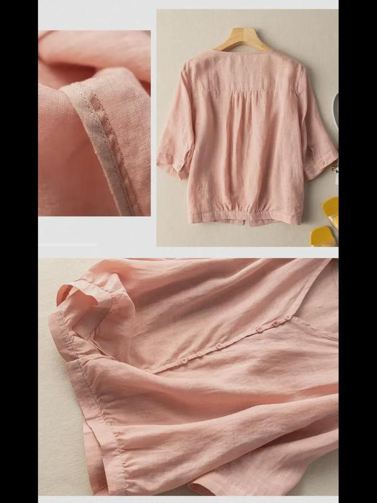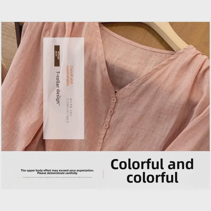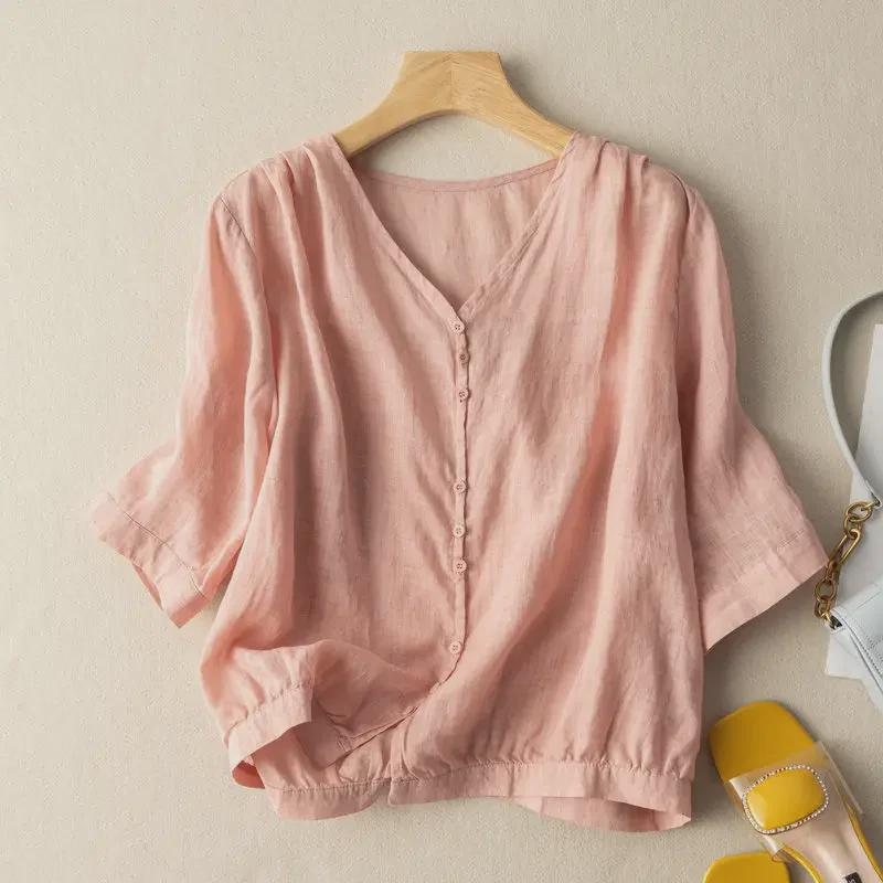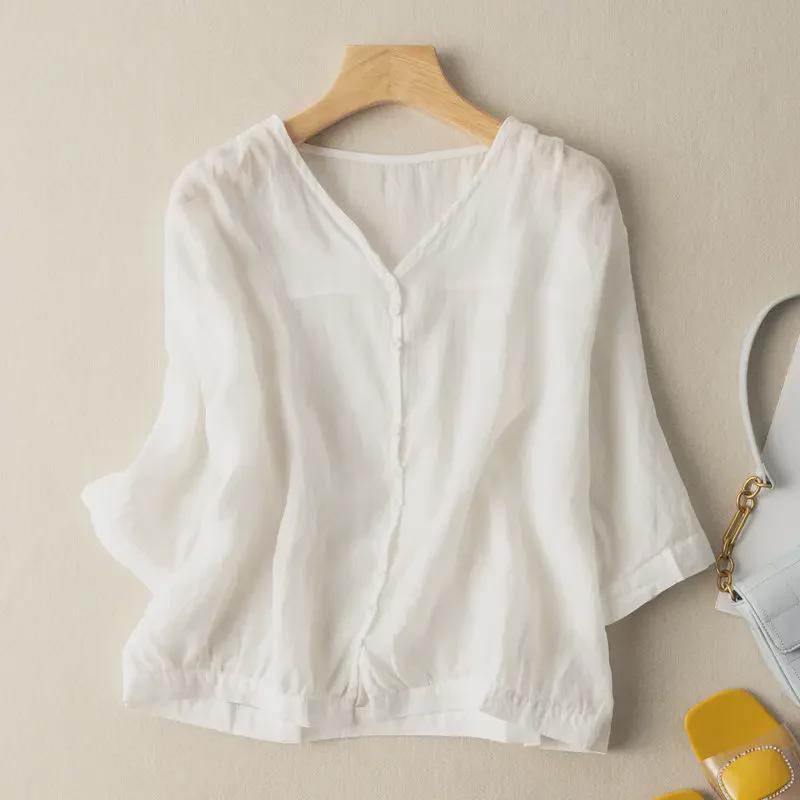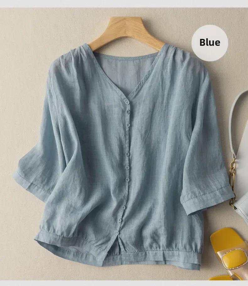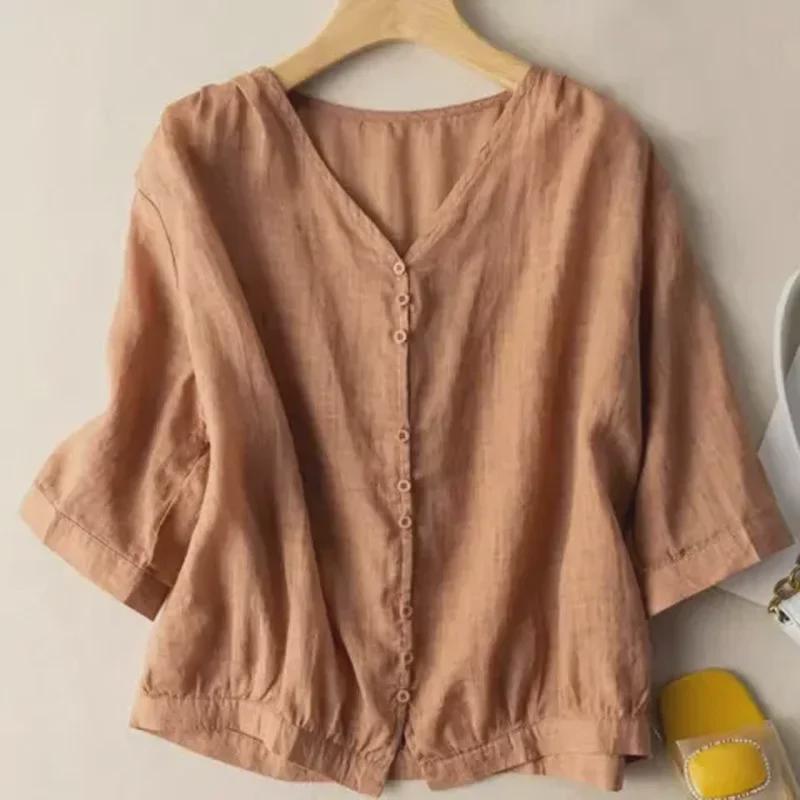 Хлопковый топ в стиле ретро с V-образным вырезом: Легкая рубашка с рукавом 3/4 для весны и лета — доступны большие размеры