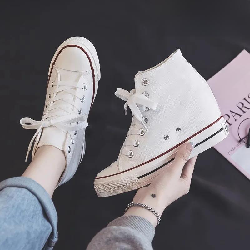 Новые туфли на каблуках 8 см, повседневные холщовые кроссовки, дизайнерские женские туфли на платформе и танкетке со скрытым каблуком, увеличивающие рост, белые и черные