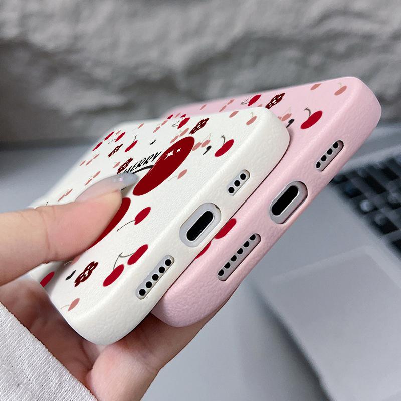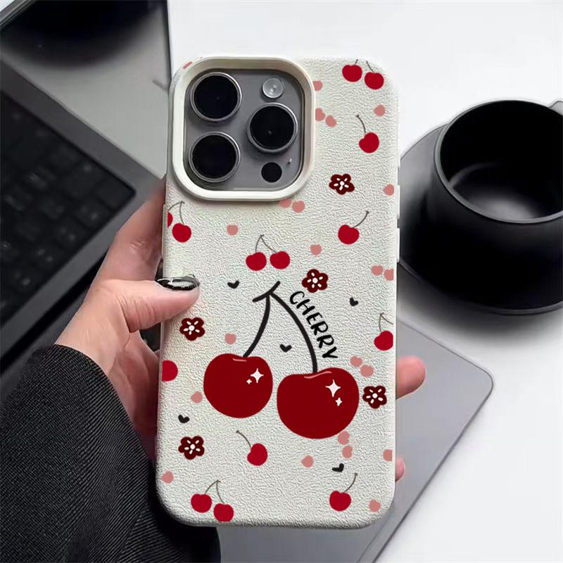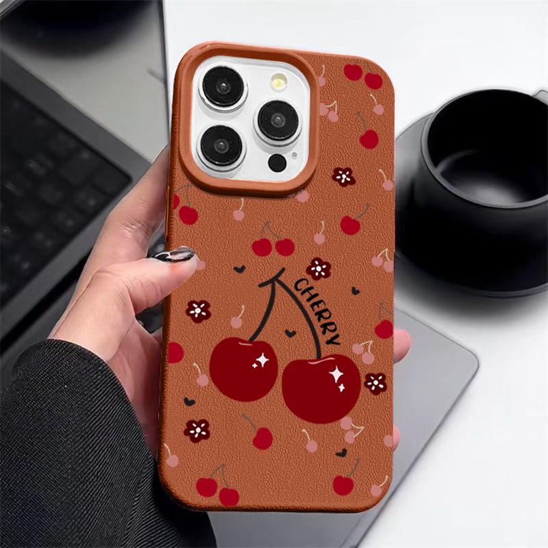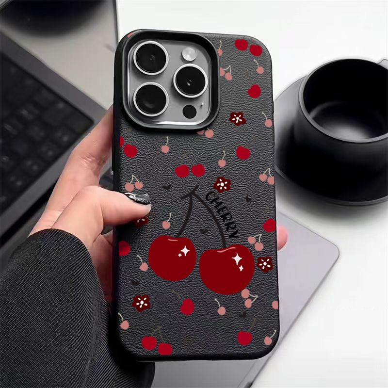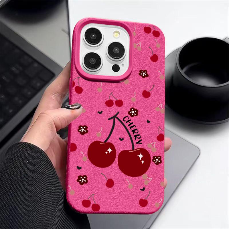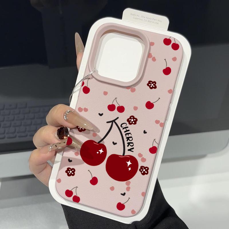 Милый чехол с принтом вишневых цветов, противоударный матовый чехол для iPhone 16 Pro Max 15 14 Pro 13 12 11, кожаная текстура TPU, тонкий мягкий чехол для телефона