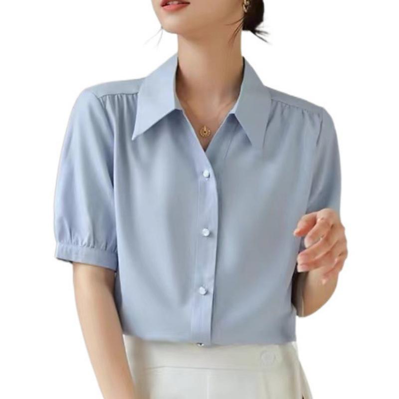 Синяя рубашка с короткими рукавами, женская летняя рубашка с V-образным вырезом, профессиональный темперамент, формальное платье, свободный топ с рукавами-фонариками