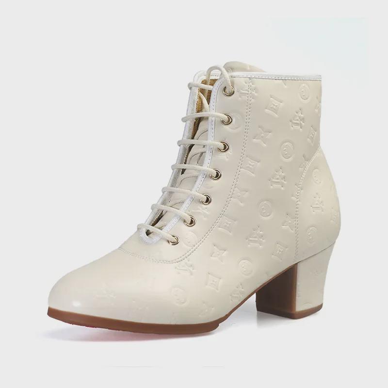 Женская обувь для танцев квадратной формы: Средний/высокий каблук, высокое голенище, мягкая подошва, тисненая кожа, идеально подходит для людей среднего/пожилого возраста, отлично подходит для осени/зимы.