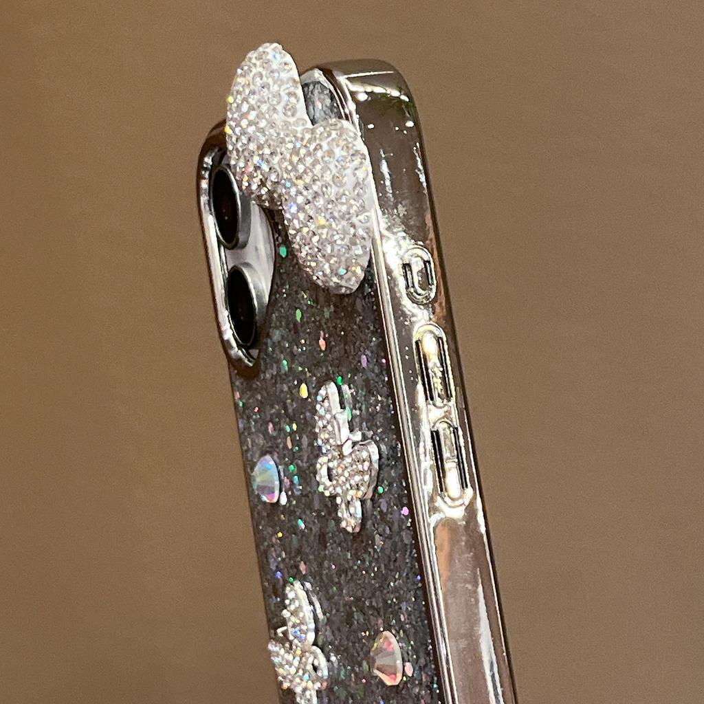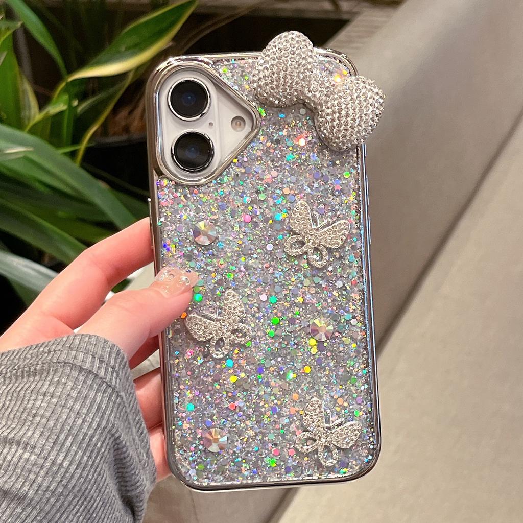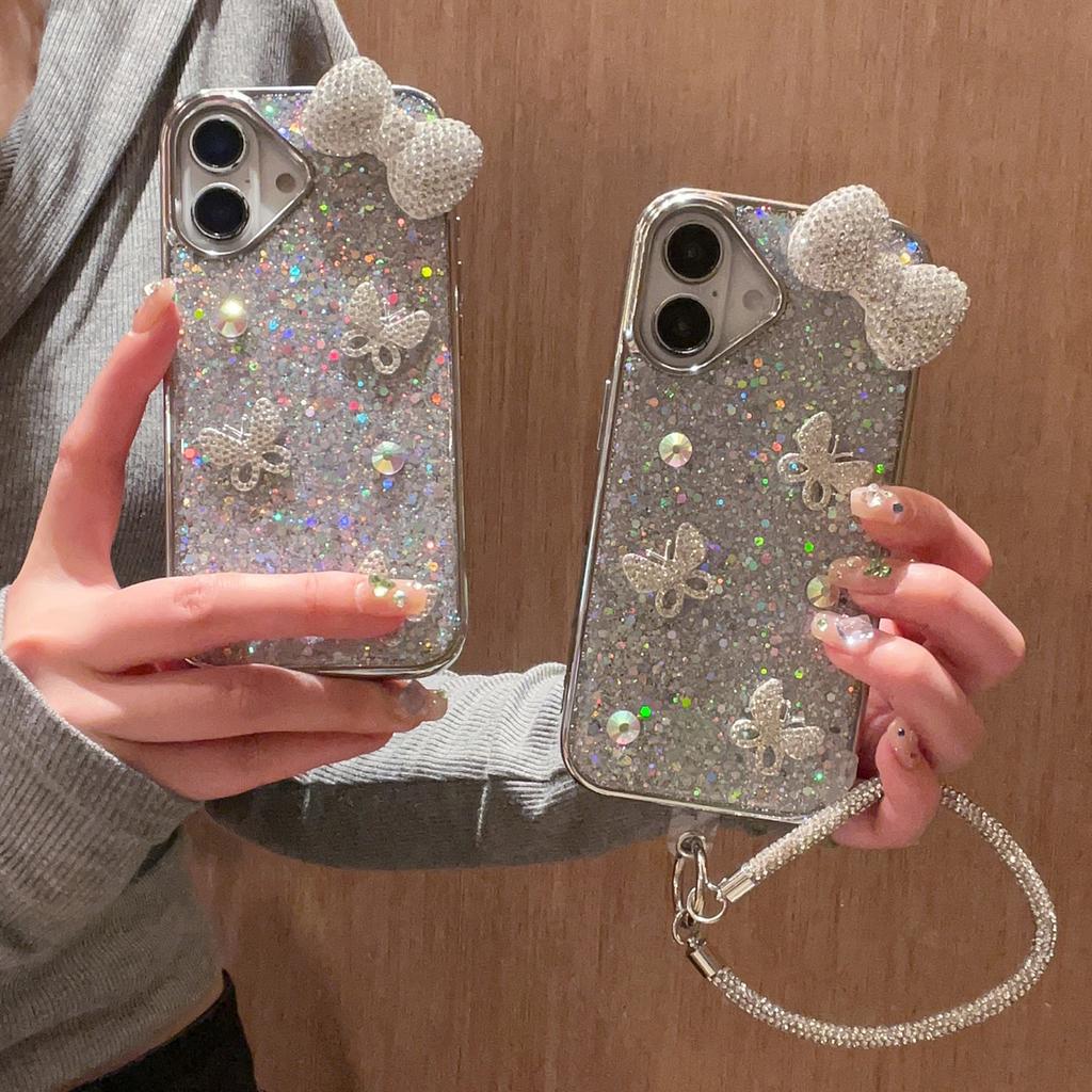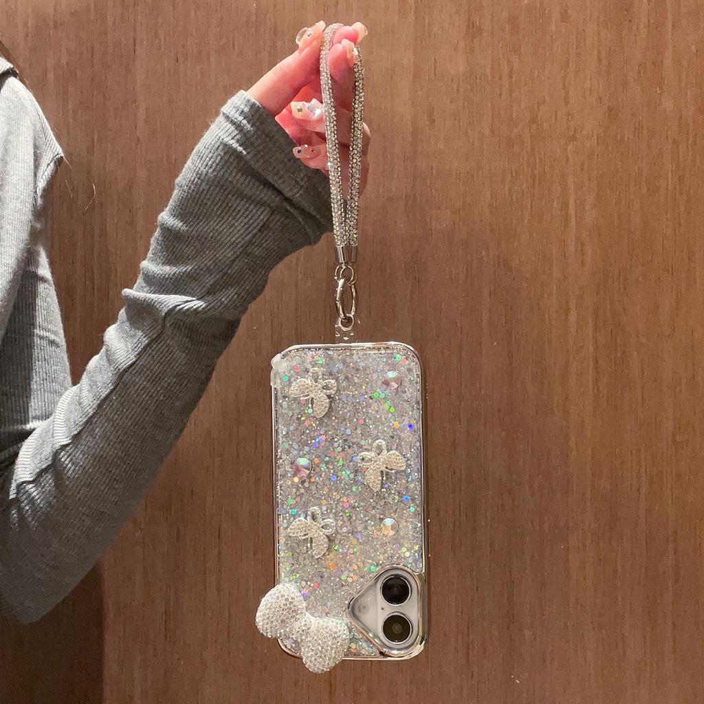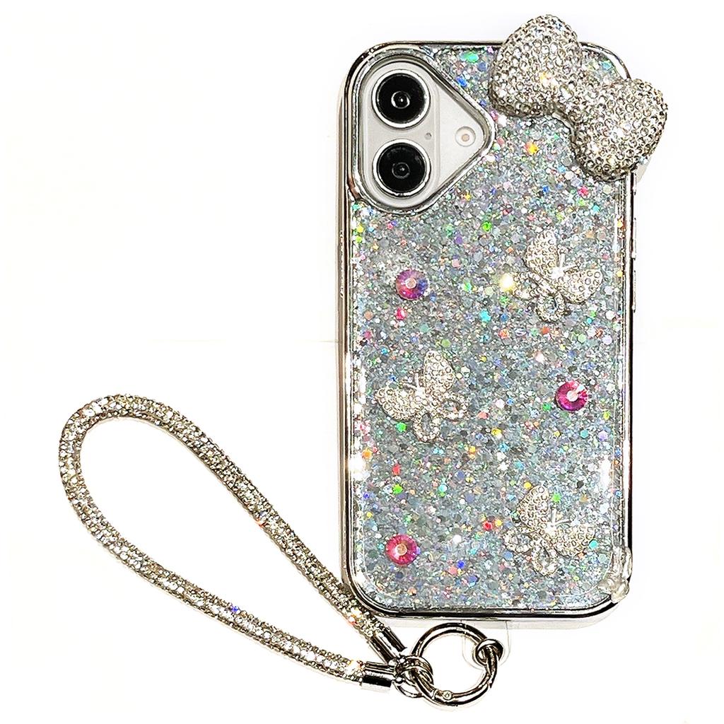 For iPhone 16 Case Rhinestone Bowknot Decor Epoxy Hybrid Phone Cover with Strap