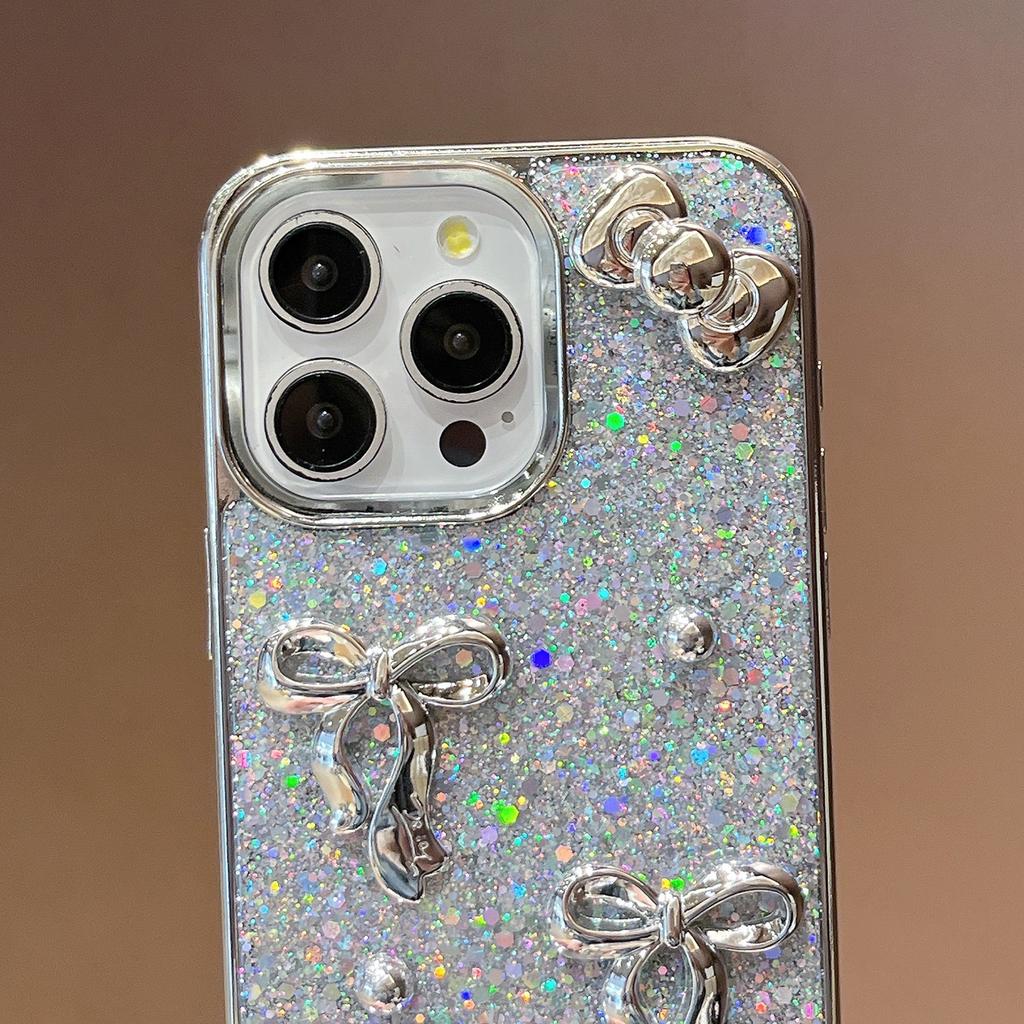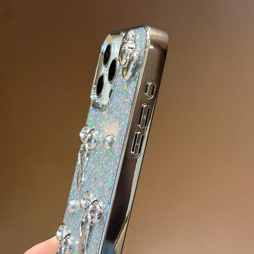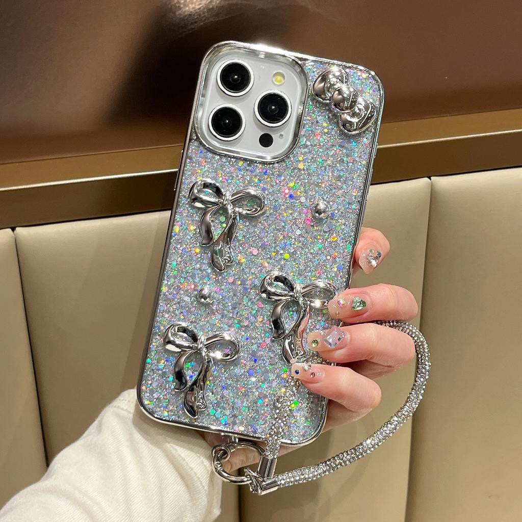 For iPhone 16 Case Electroplated Bowknot Glitter Epoxy Phone Back Cover with Strap