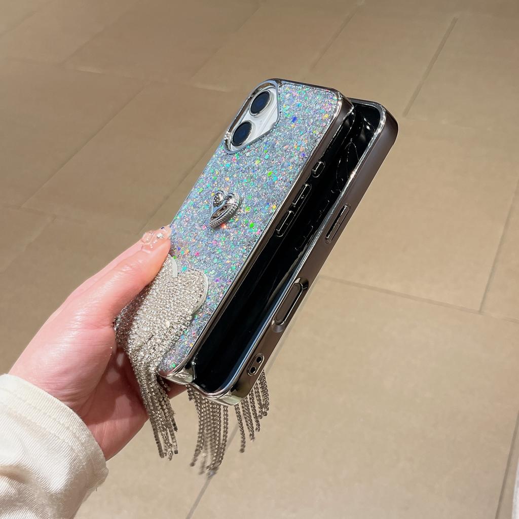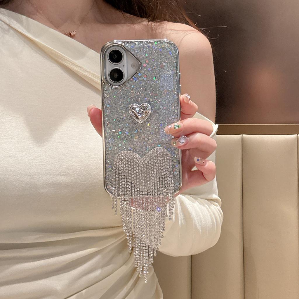 For iPhone 16 Protective Case Electroplated Glitter Heart Tassel Design Epoxy Phone Cover
