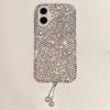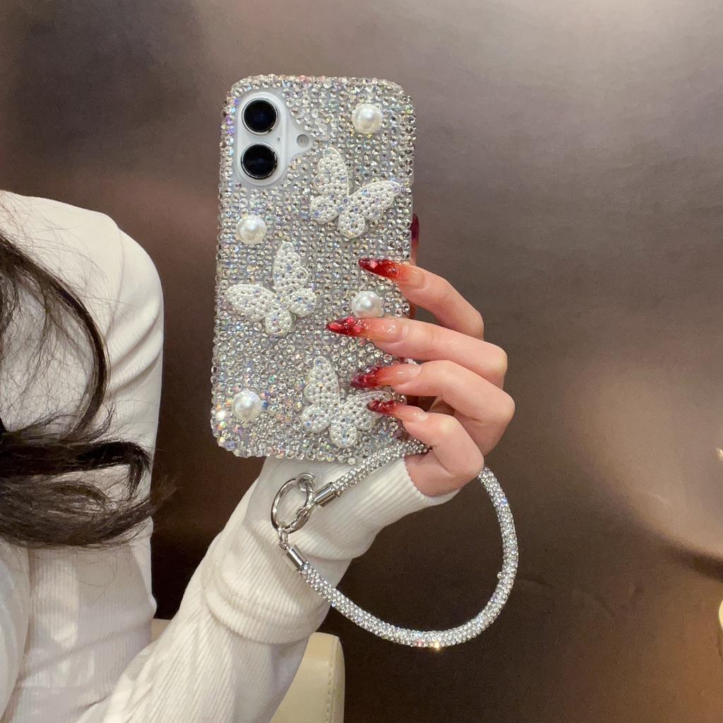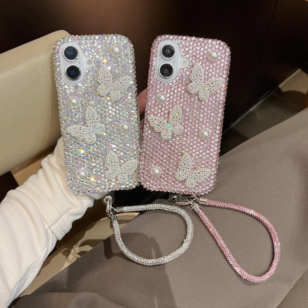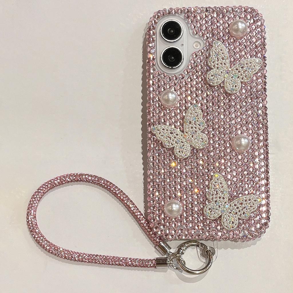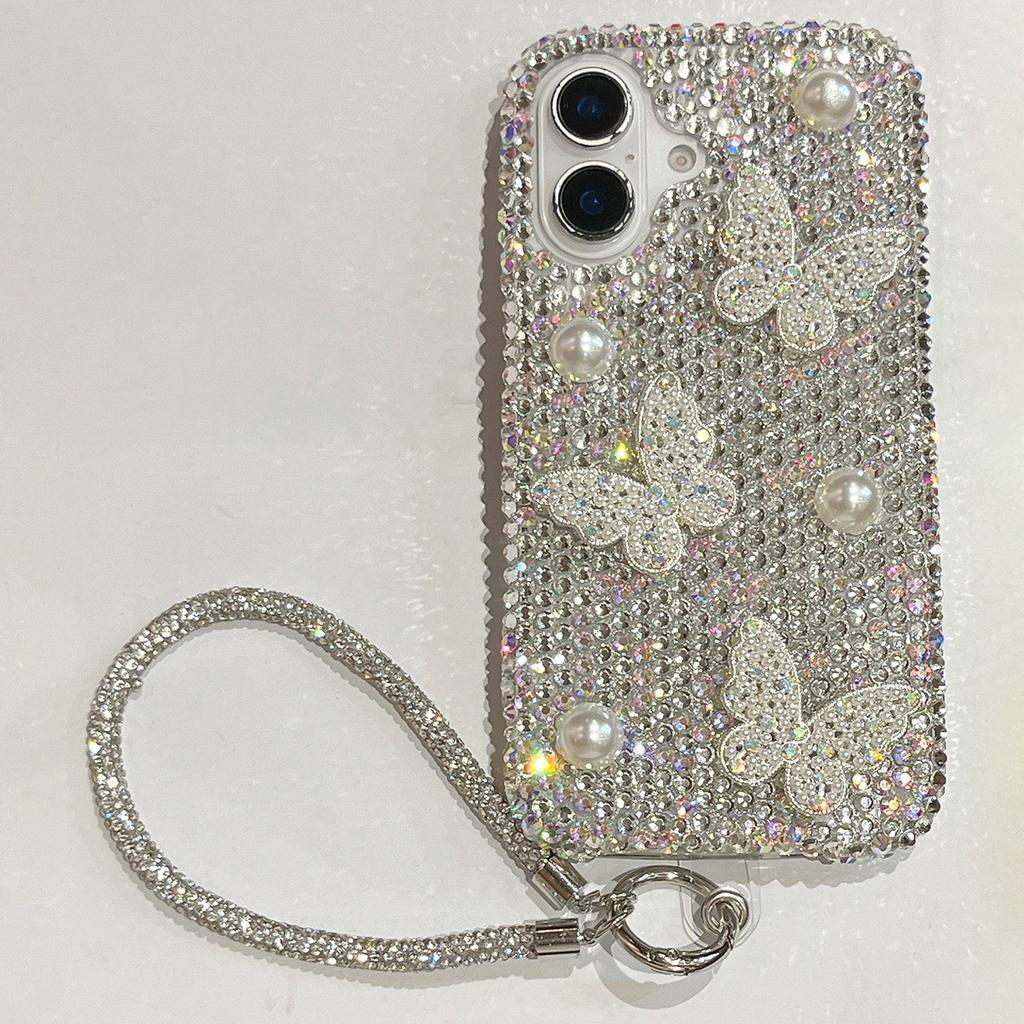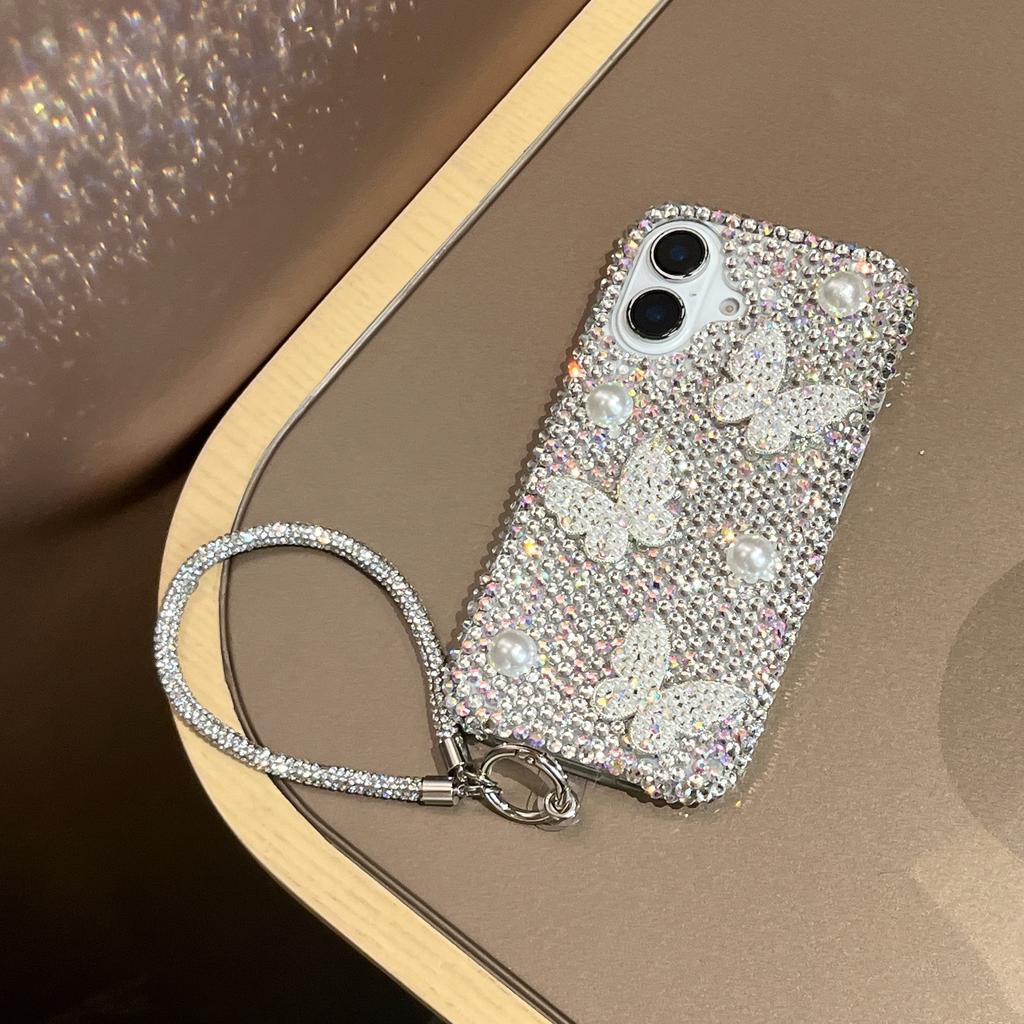 For iPhone 16 Case with Strap Luxury Pearl Butterfly Rhinestones Decor Phone Cover - White