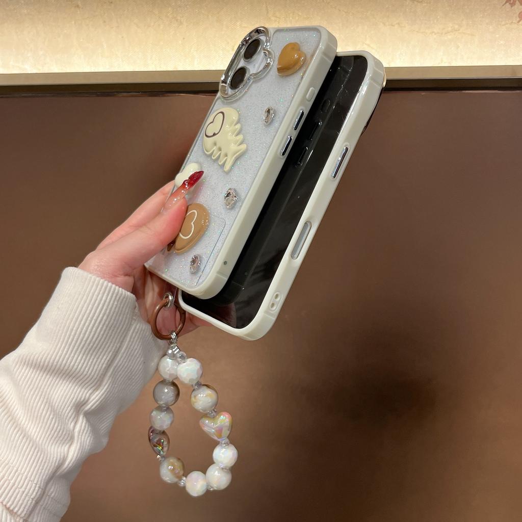 For iPhone 16 Case with Strap Glitter Heart Double Fishbone Epoxy PC TPU Phone Cover