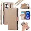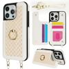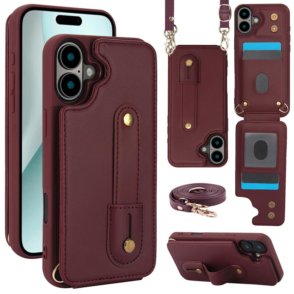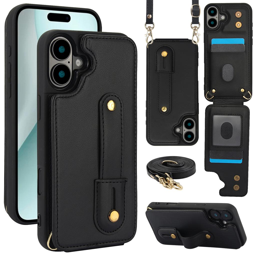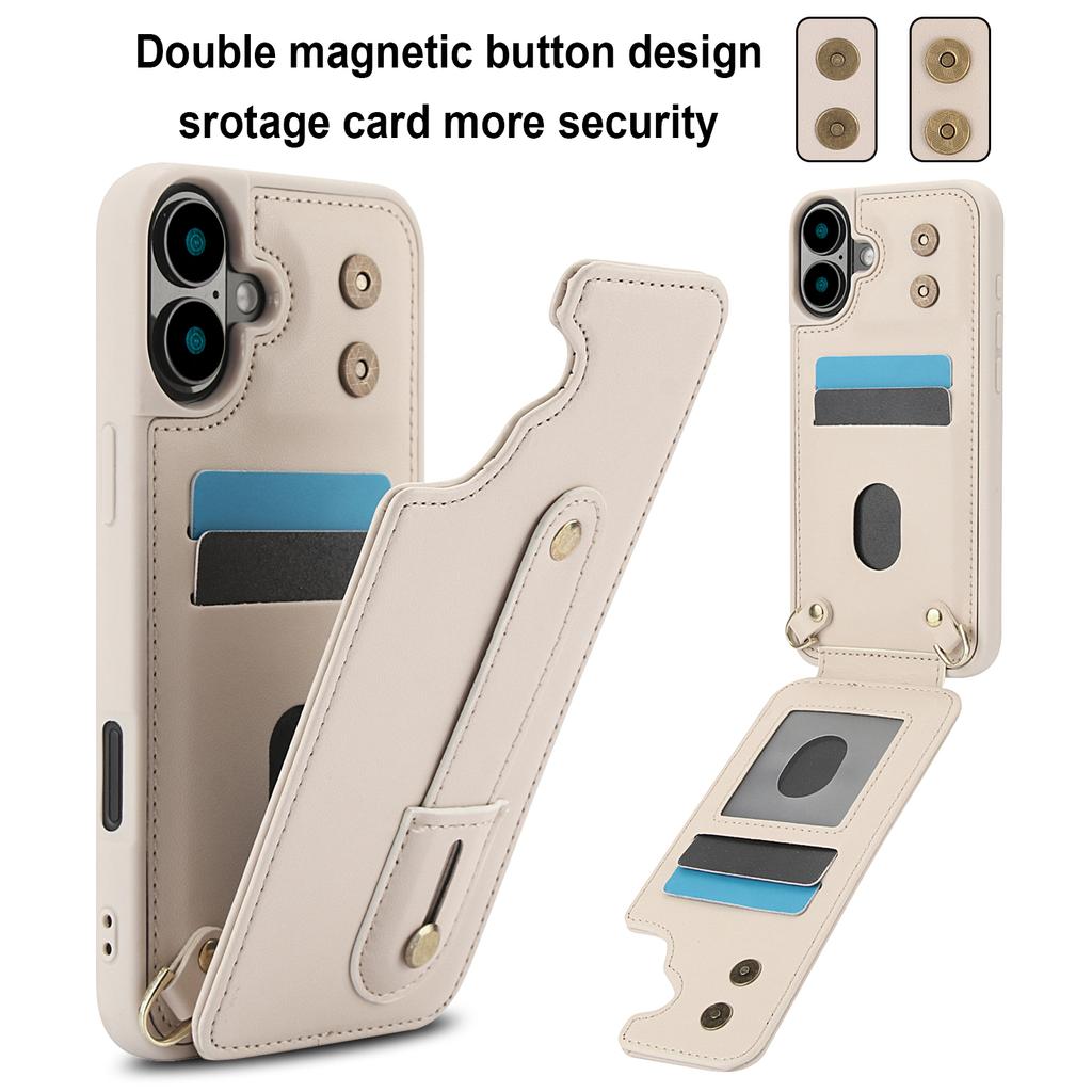 For iPhone 16 Case Kickstand Card Slots Leather Coated TPU Cover with Shoulder Strap - Beige