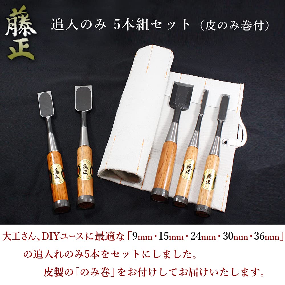Мы создали набор из 5 размеров, которые особенно востребованы: 9 мм, 15 мм, 24 мм, 30 мм, 36 мм — идеально подходит для плотников и любителей домашнего хозяйства.. Он будет поставляться с кожаным ``маки''.