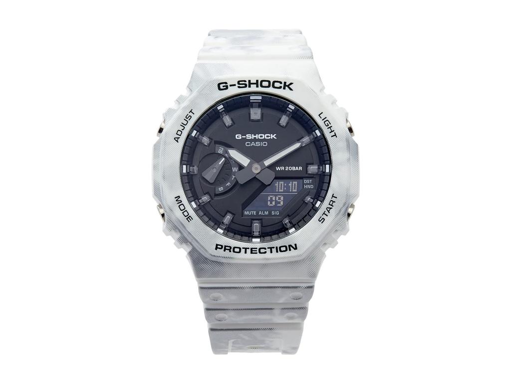 Аналогово-цифровой GAE2100GC-7A, дизайн которого вдохновлен снежным камуфляжем, выполнен в зимнем камуфляжном стиле, создавая иллюзию стильной и прохладной морозной текстуры.. В этот специальный набор входят ремешок и безель цвета хаки зеленого цвета.