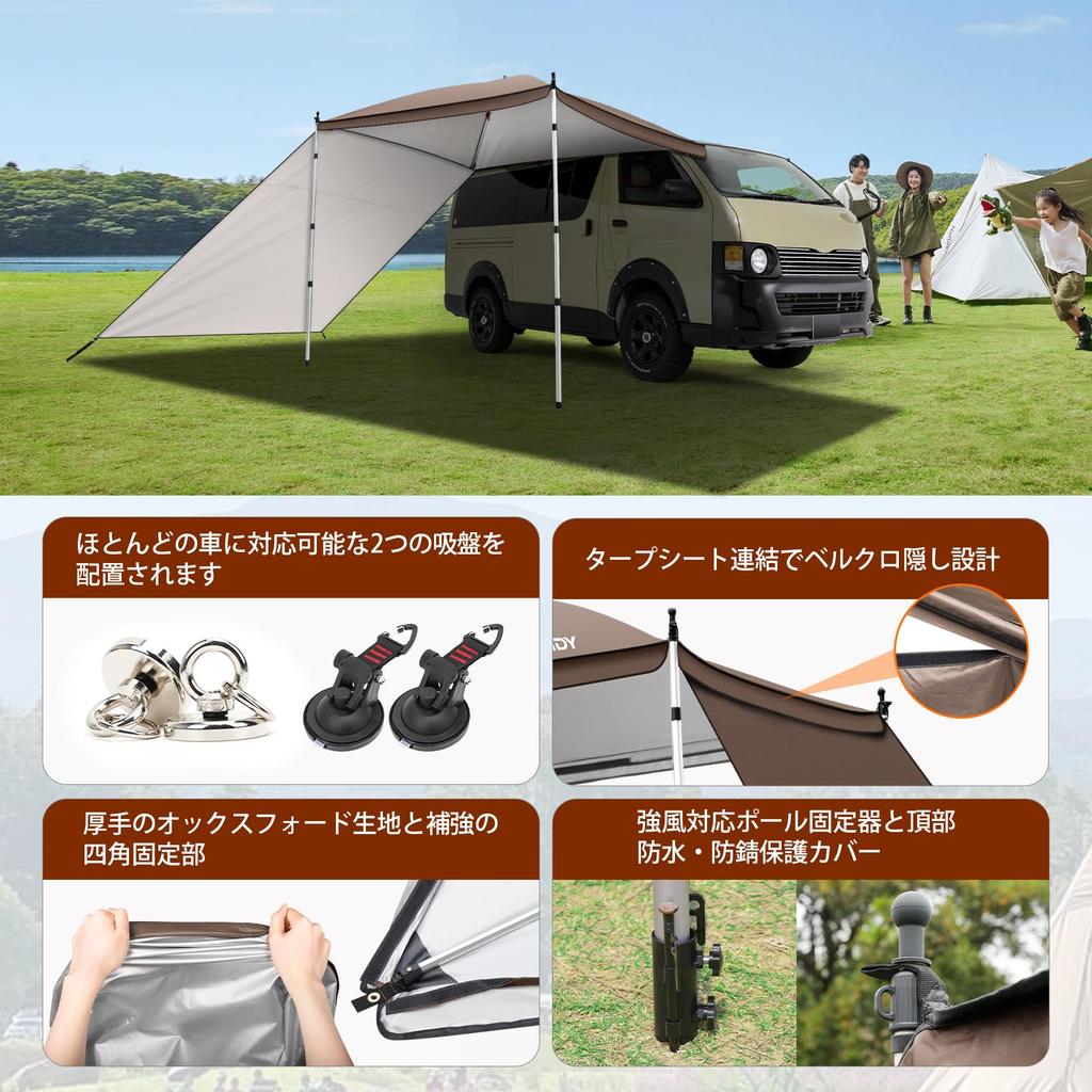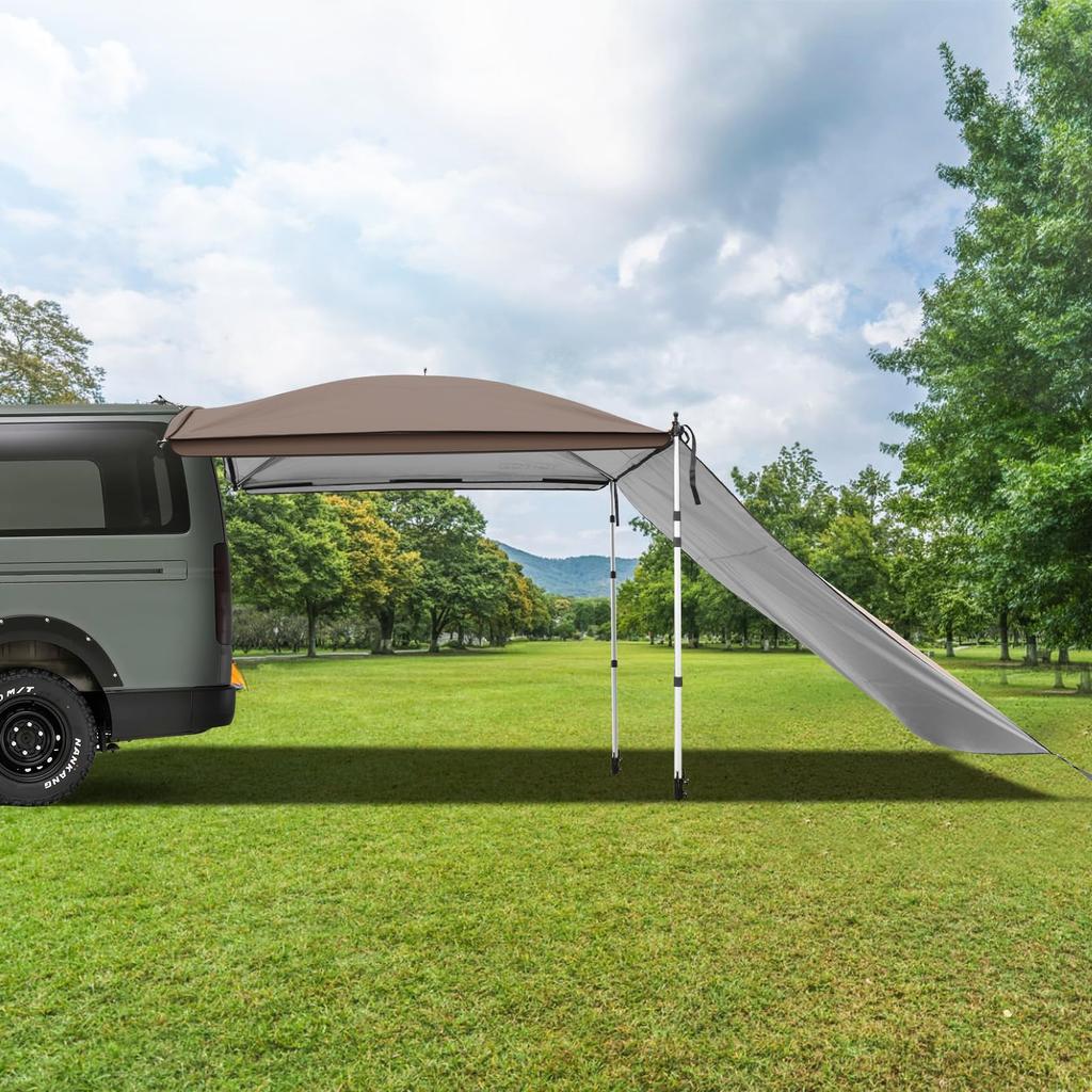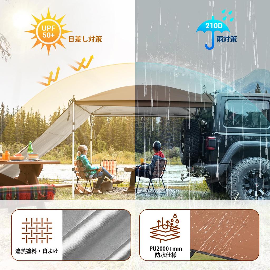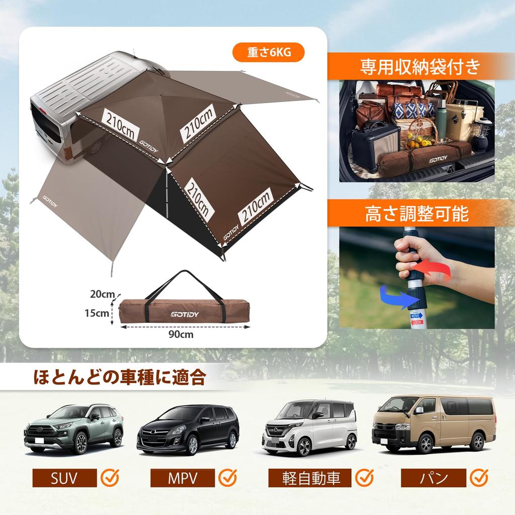[Просторное и просторное пространство] Вас беспокоит, что во время автокемпинга вы сможете проводить время только в ограниченном пространстве внутри автомобиля и спать в машине? Попробуйте удобный автомобильный тент, который можно прикрепить к вашему автомобилю.. Используя тент для боковины автомобиля, вы можете расширить свое пространство и сделать свое времяпрепровождение более расслабляющим.. В разложенном виде верхняя часть может обеспечить затененную зону размером приблизительно 210*210 см, максимально увеличивая открытое пространство при высоте потолка 230 см.. Здесь могут разместиться до 6 человек, так что вы можете наслаждаться отдыхом в одиночку или с друзьями и семьей.. [Регулировка высоты] Высоту опорной стойки брезентовой палатки можно регулировать от 90 см до 230 см, а высоту и угол затенения можно регулировать в зависимости от погоды и местоположения, что позволяет вам наслаждаться отдыхом на открытом воздухе более свободно и комфортно.