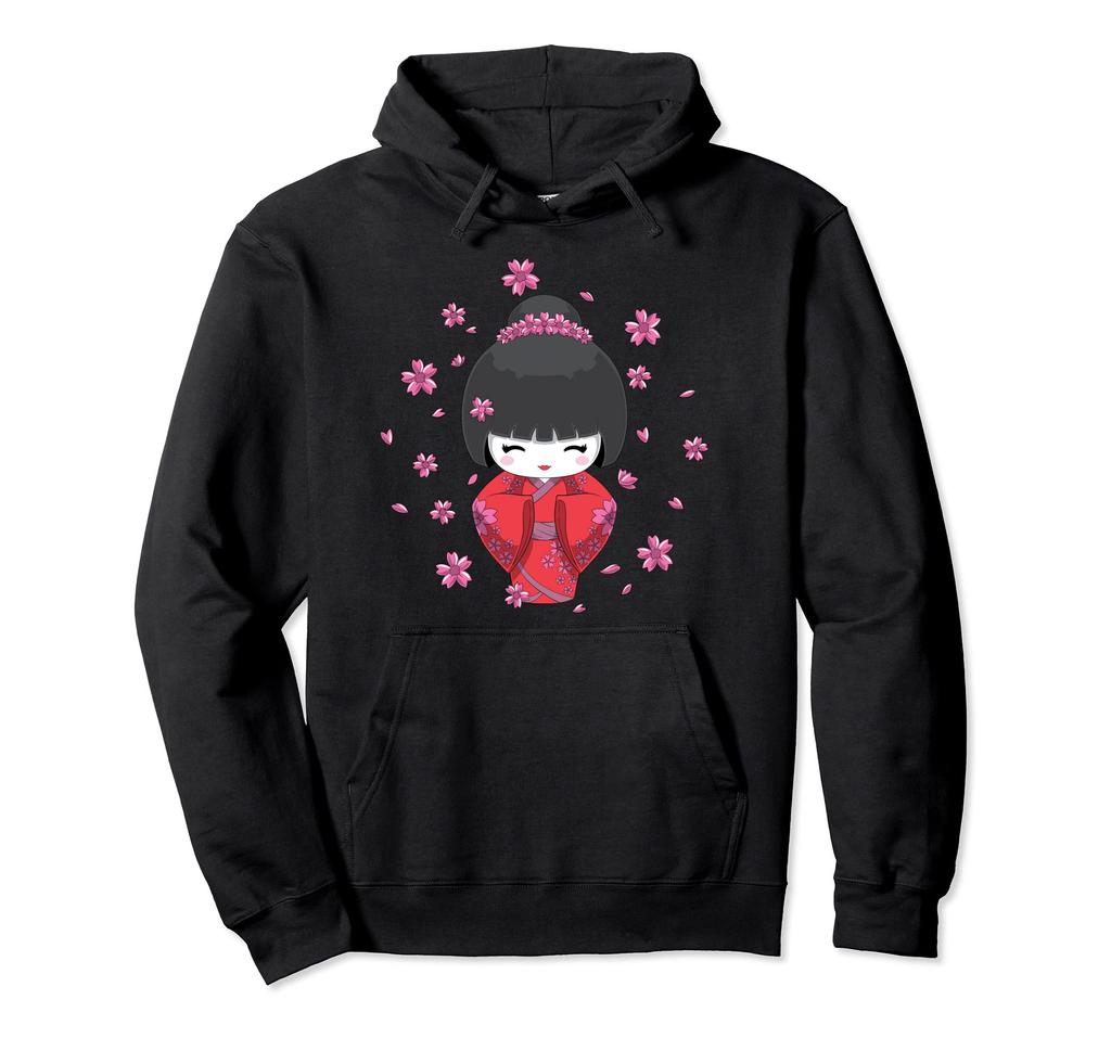 Милое японское кимоно с куклой кокеши и толстовка с капюшоном с изображением цветущей вишни
