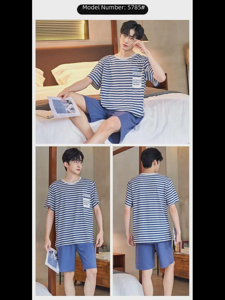 Мужской пижамный комплект из хлопка с рисунком: Летняя полоска, круглый вырез, короткие рукава, шорты, большие размеры.