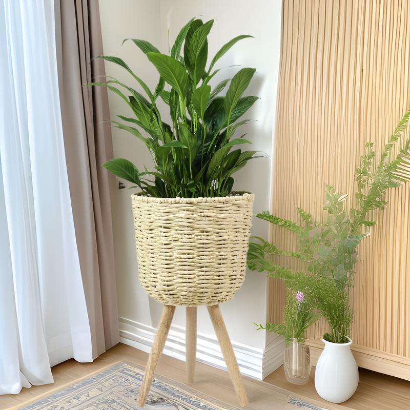 Корзина для цветов из соломы и ротанга в скандинавском стиле с деревянной подставкой для украшения интерьера