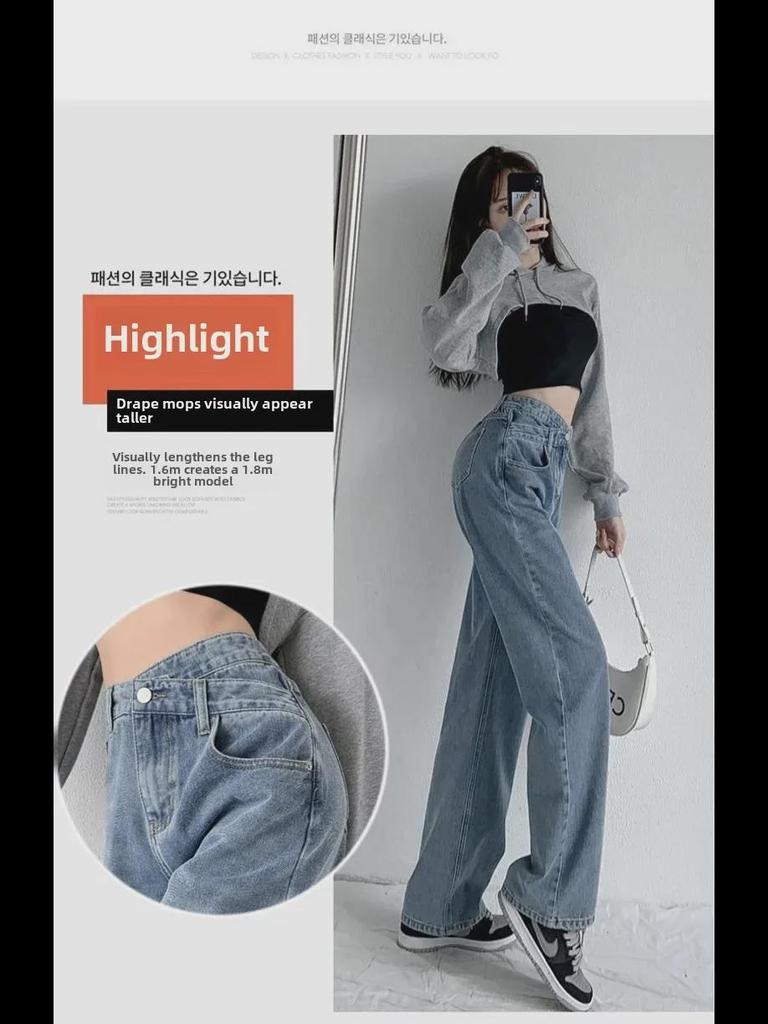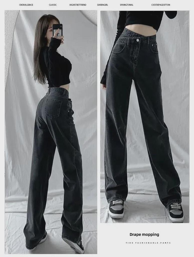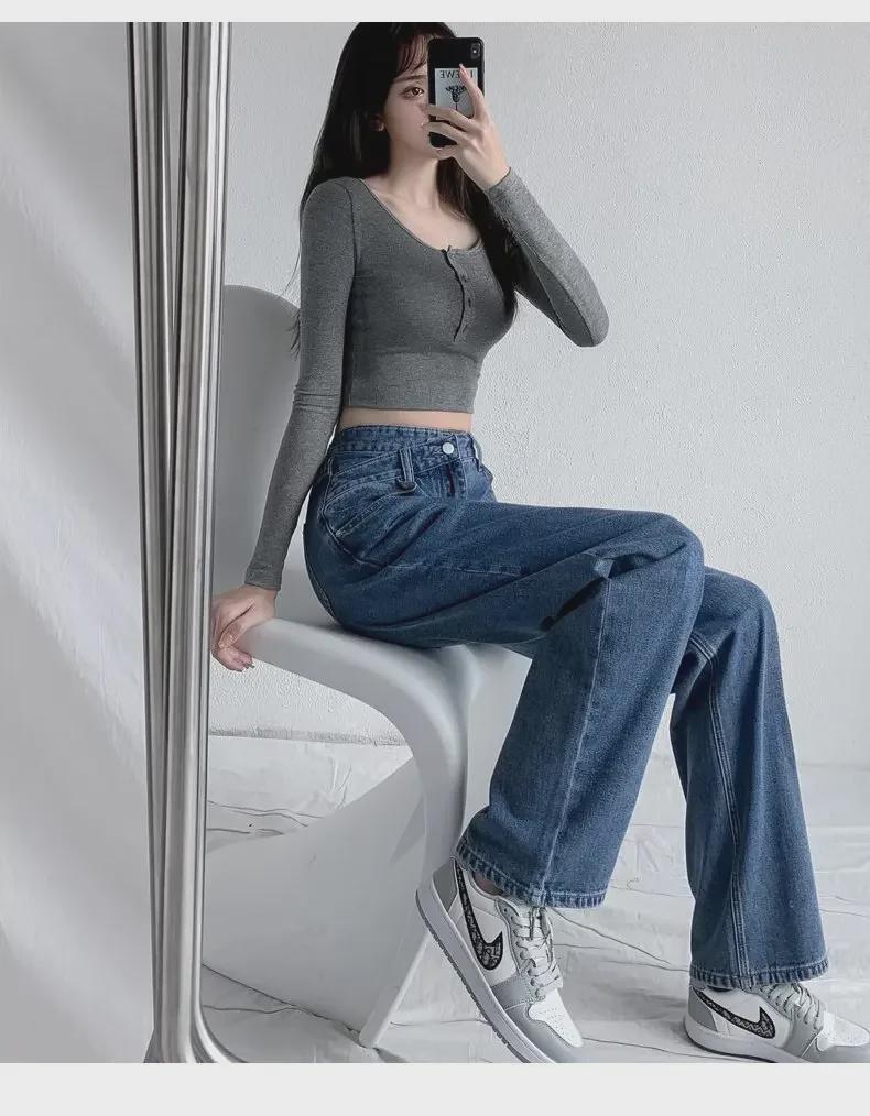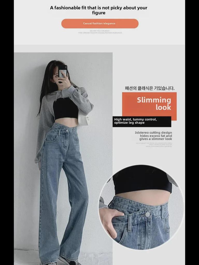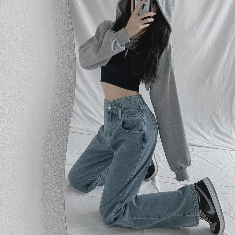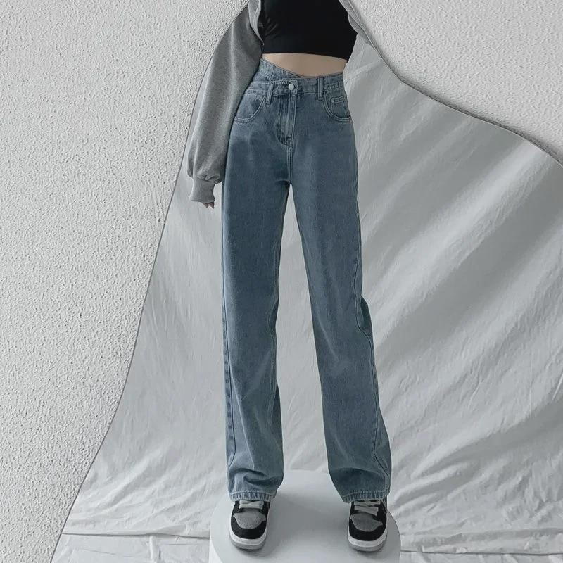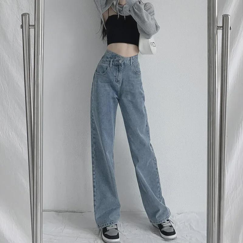 Женские джинсы с высокой талией и широкими штанинами, косой пряжкой — облегающие, свободные, нестандартного дизайна