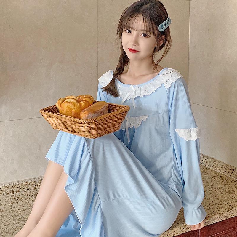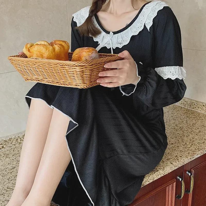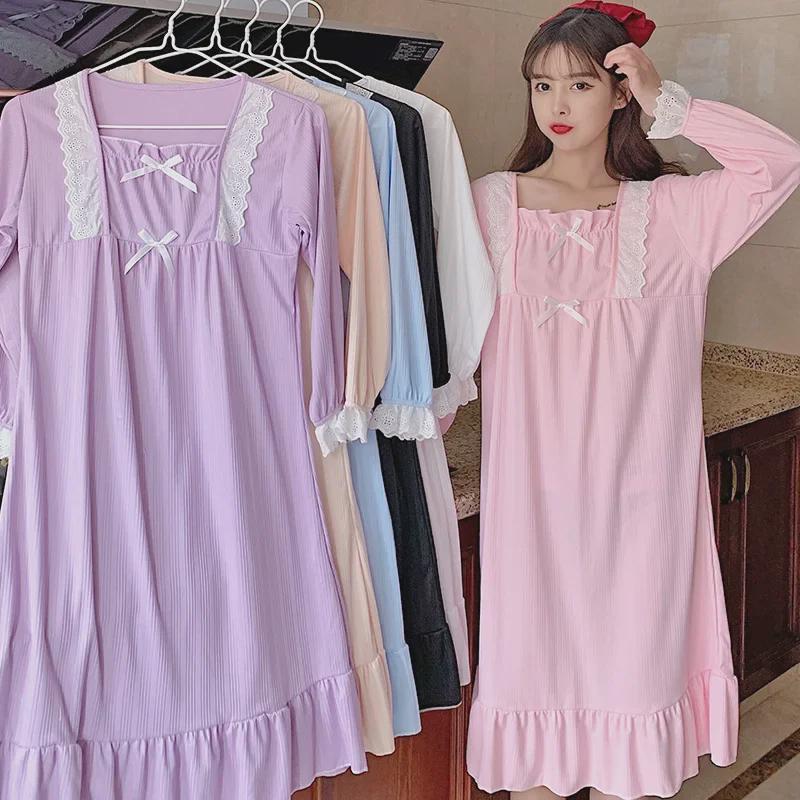 Женская кружевная ночная рубашка с длинным рукавом - имитация хлопка, 220 г, однотонная, стиль «принцесса» на весну и осень