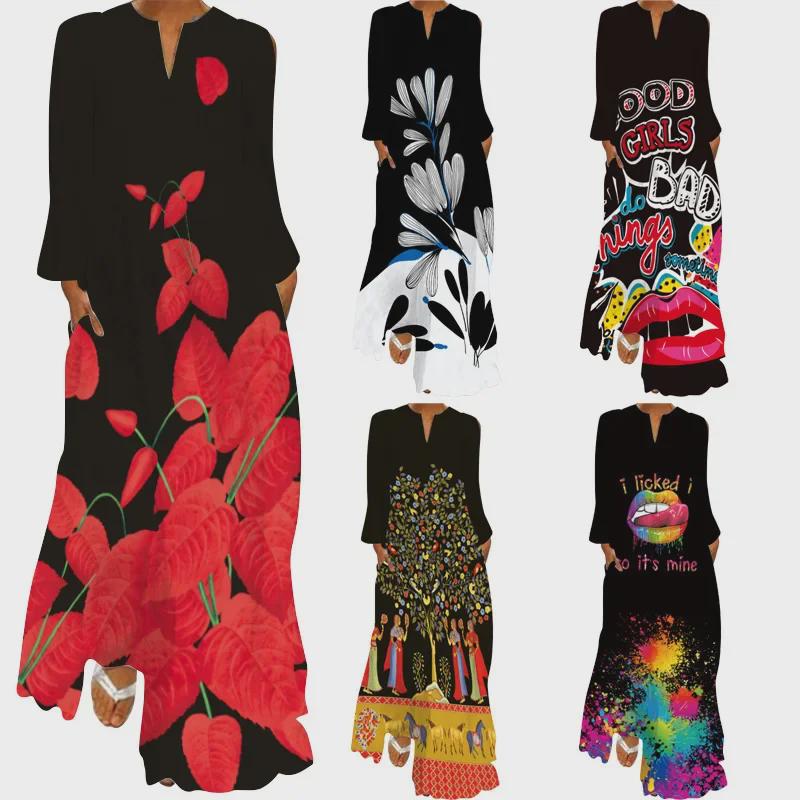 Женское платье макси с принтом бабочек в стиле ретро 2024 года, V-образным вырезом, длинными рукавами и карманами