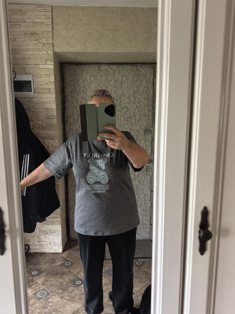 Брала 2хл на обьем по груди 104, объем бёдер 106. Хотела по свободнее, а так впритык. Качество синтетика, но комфортно к телу, на вид похоже на хб. Рисунок не зелёный на футболке, а ближе светлая мята цвет.