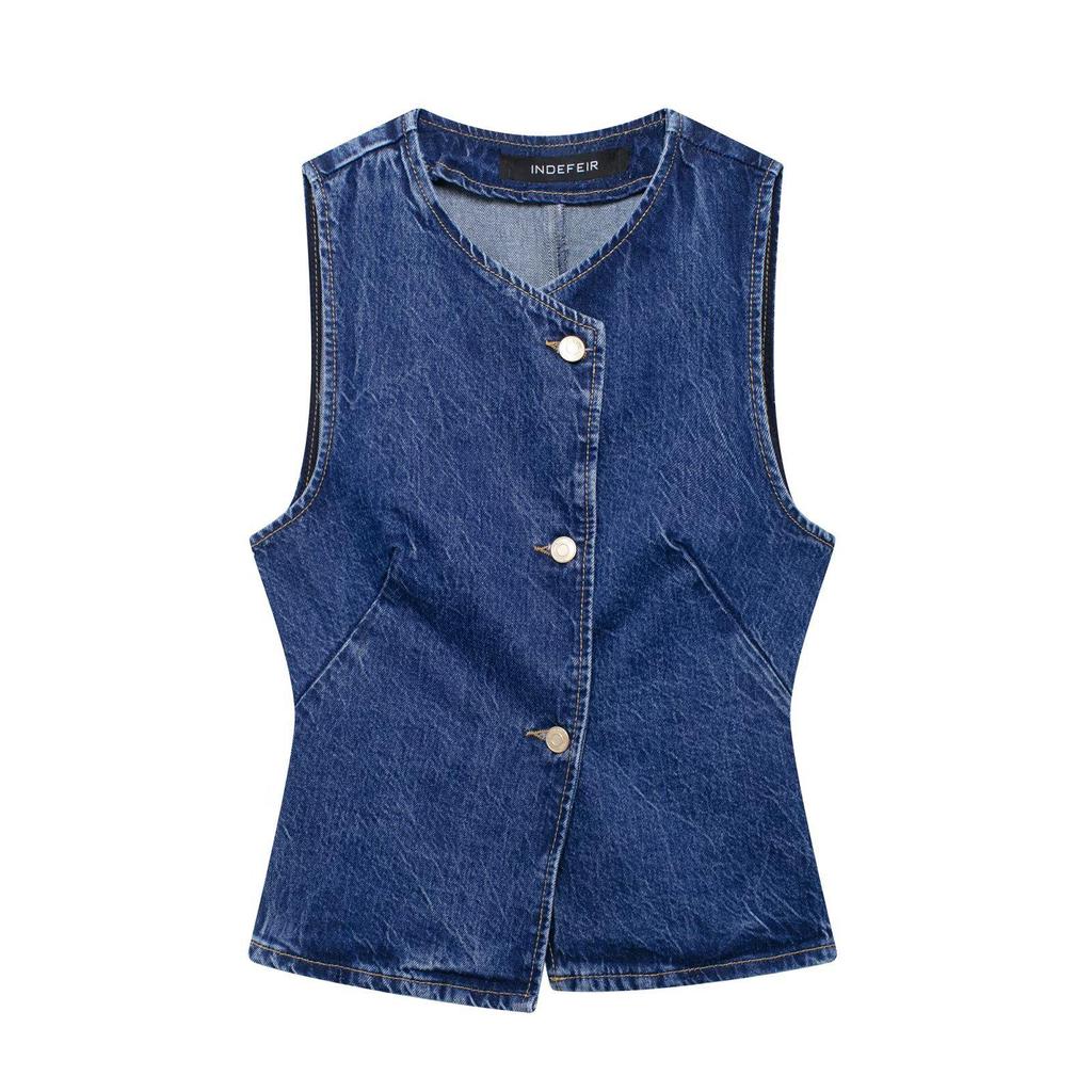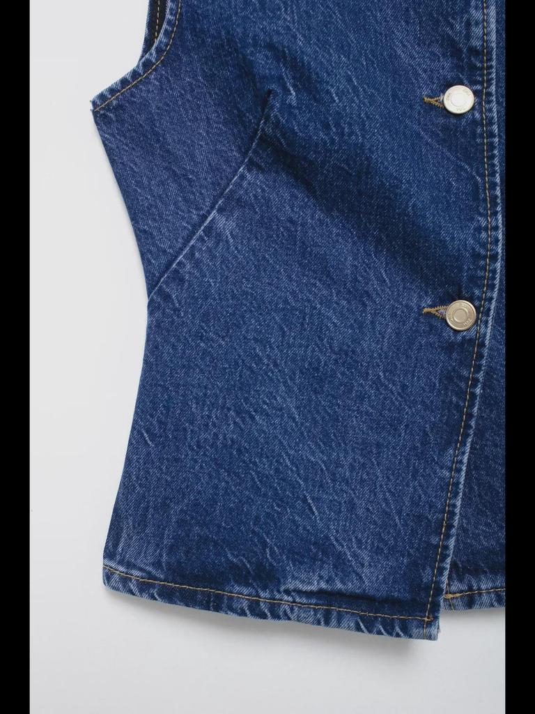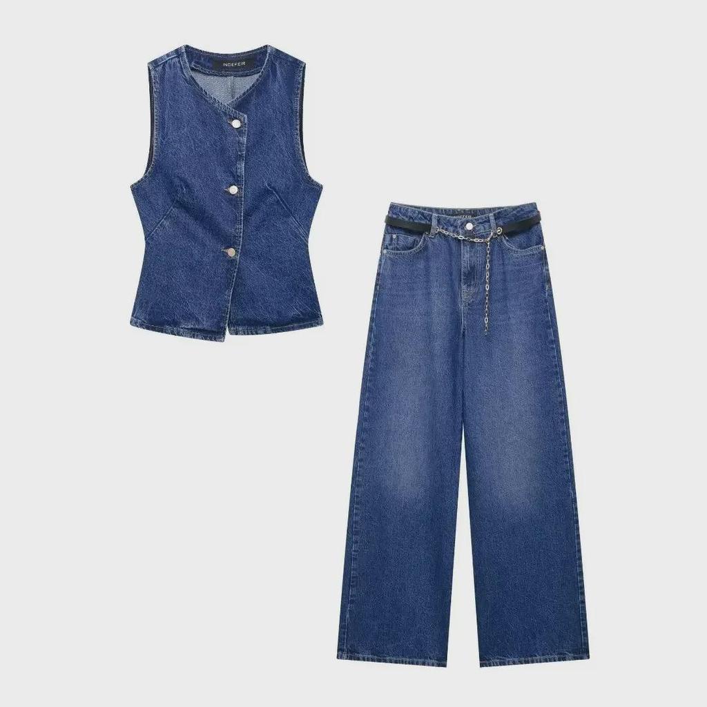 Этот стильный комплект отличается однотонным узором и изготовлен из приятного на ощупь полиэстера.. Ансамбль включает в себя джинсовый жилет с круглым вырезом и однобортной застежкой в сочетании с модными широкими брюками.. Этот наряд идеально подходит для создания модного и целостного образа, он легко сочетает в себе современный стиль с классическими элементами, что делает его универсальным дополнением к любому гардеробу.