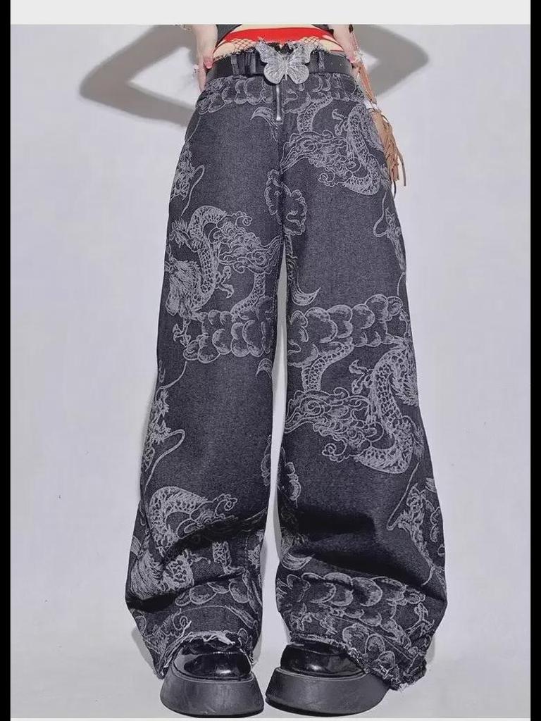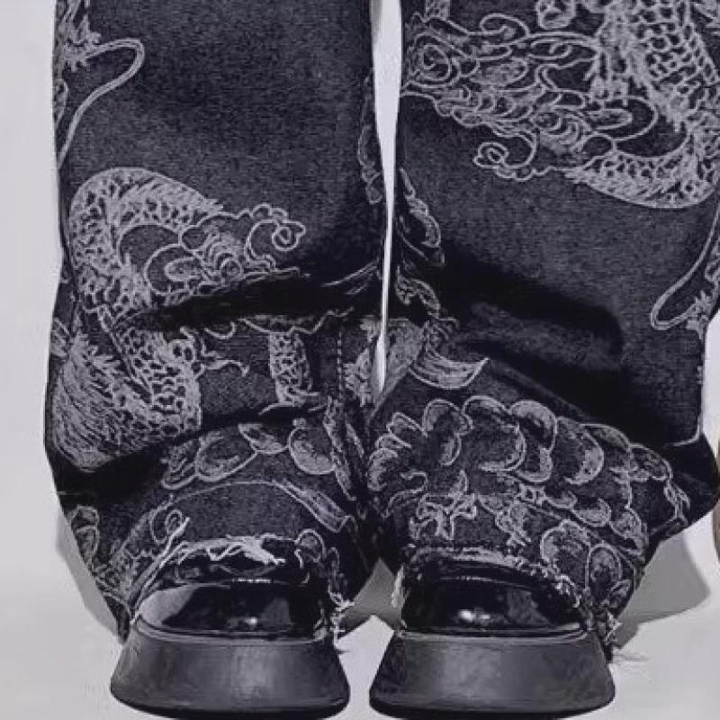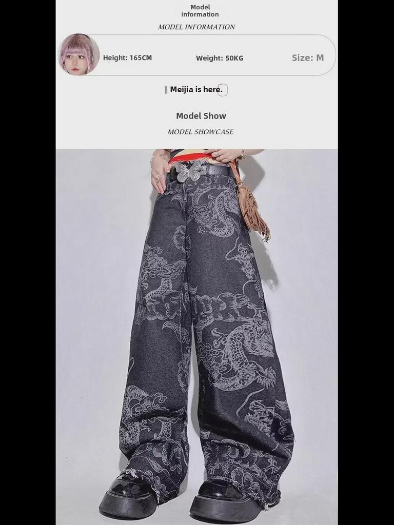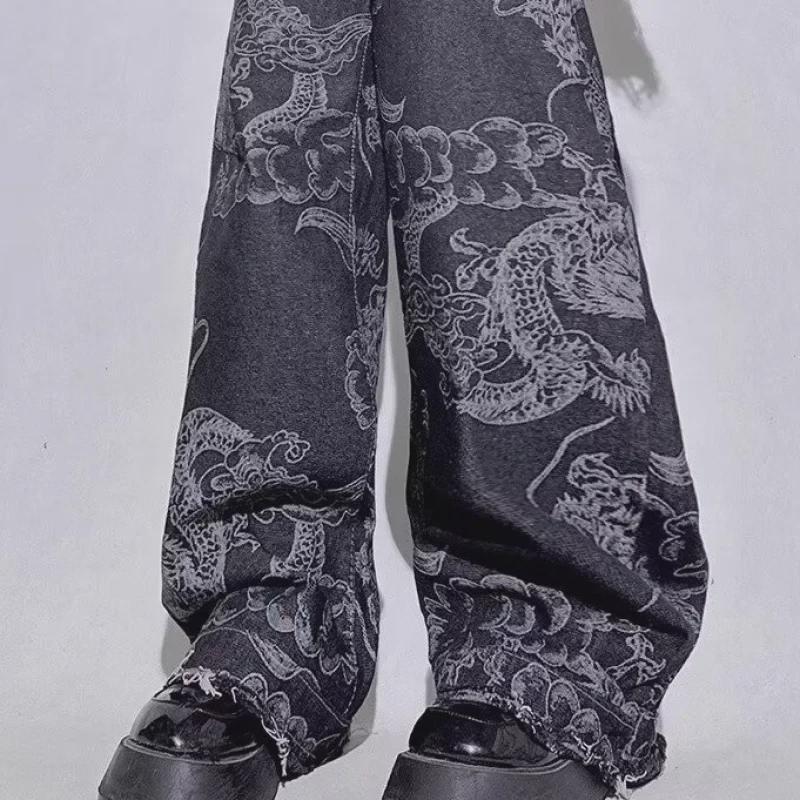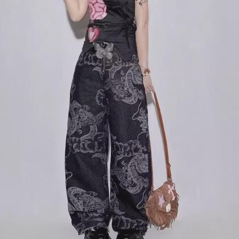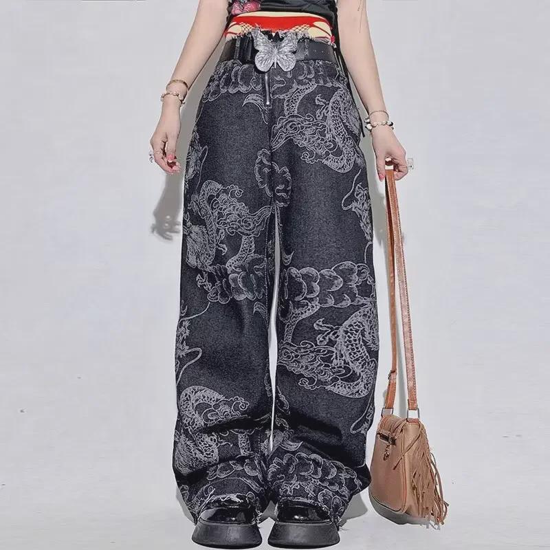 Джинсы с высокой талией и широкими штанинами весна/лето 2024 года с вышитым драконом