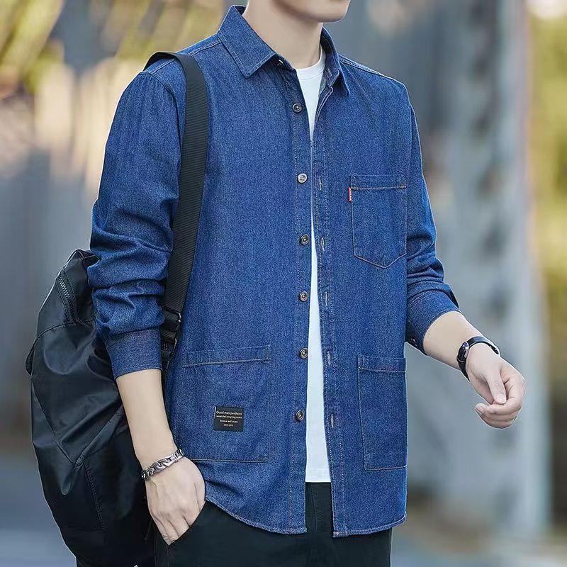 Мужская свободная джинсовая повседневная рубашка с длинным рукавом