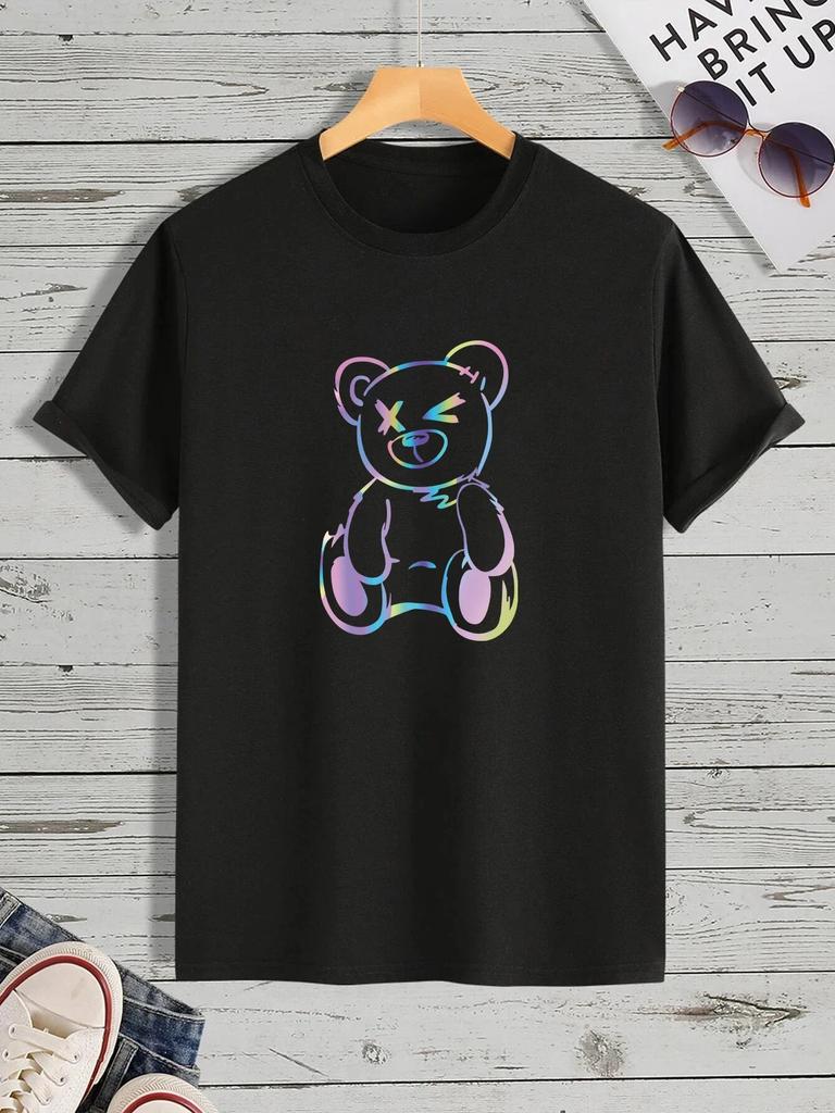 Футболка с принтом Letter Bear 100% хлопок, летняя, 2023 г., высокого качества, Harajuku Clothing, для отдыха, уличного фитнеса, футболка с круглым вырезом