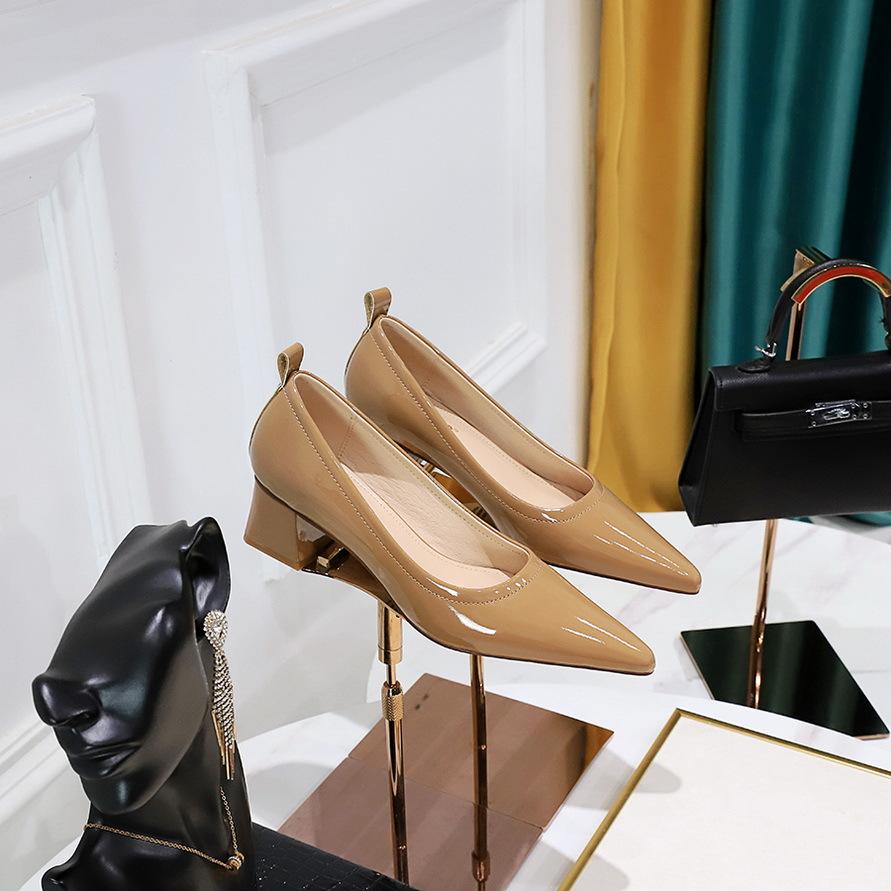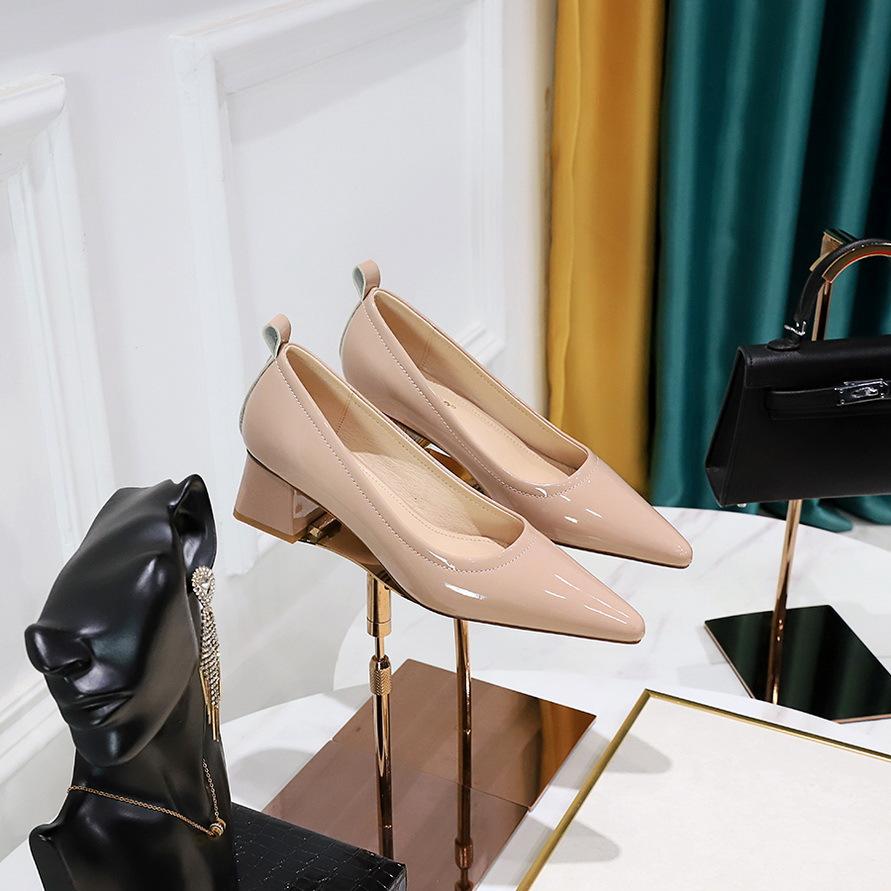Стильные, простые и удобные, универсальные, на толстом каблуке, из лакированной кожи среднего каблука, с неглубокой заостренной головкой, профессиональные женские туфли OL