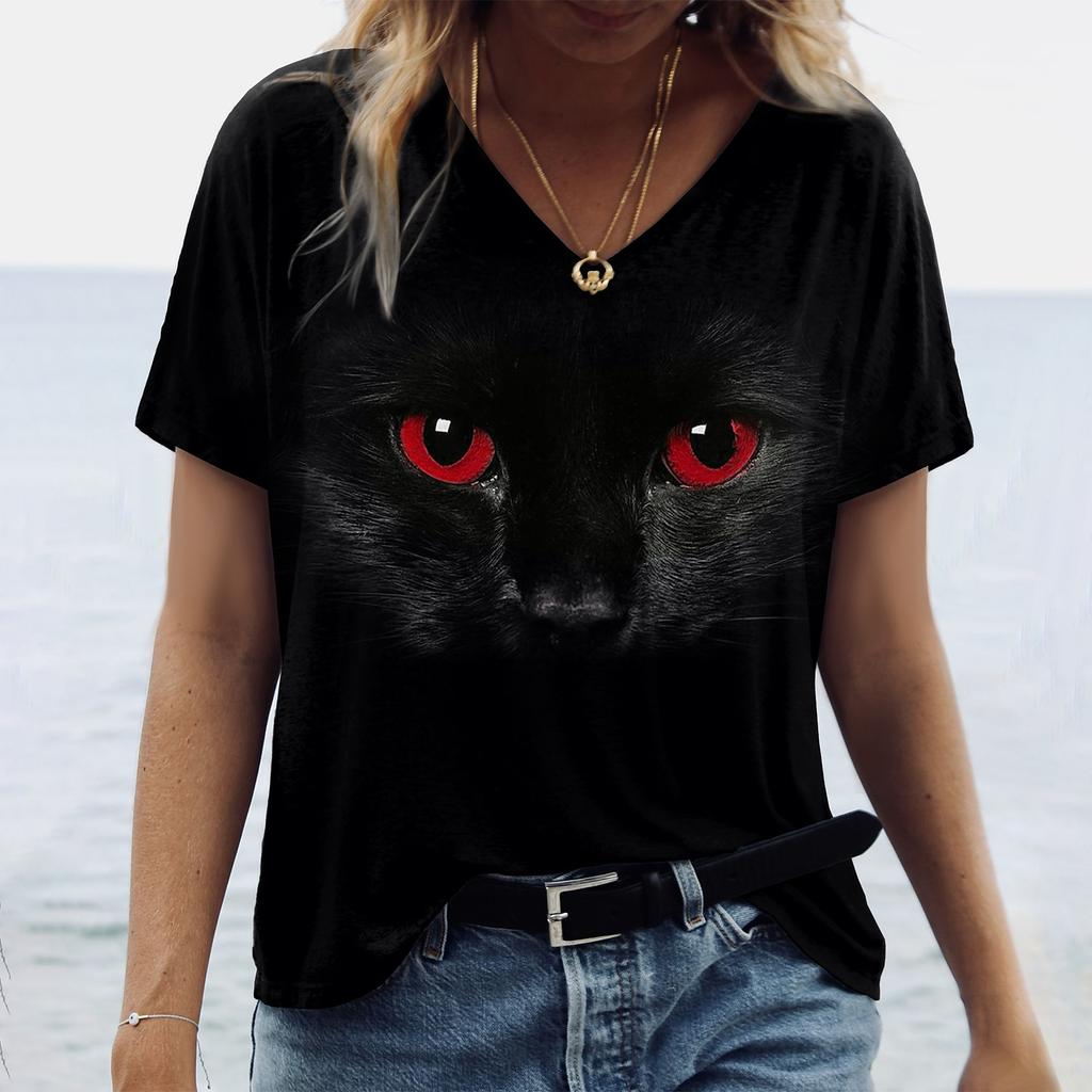 Летний топ с V-образным вырезом и 3D-принтом в виде котенка, модные повседневные женские футболки с короткими рукавами