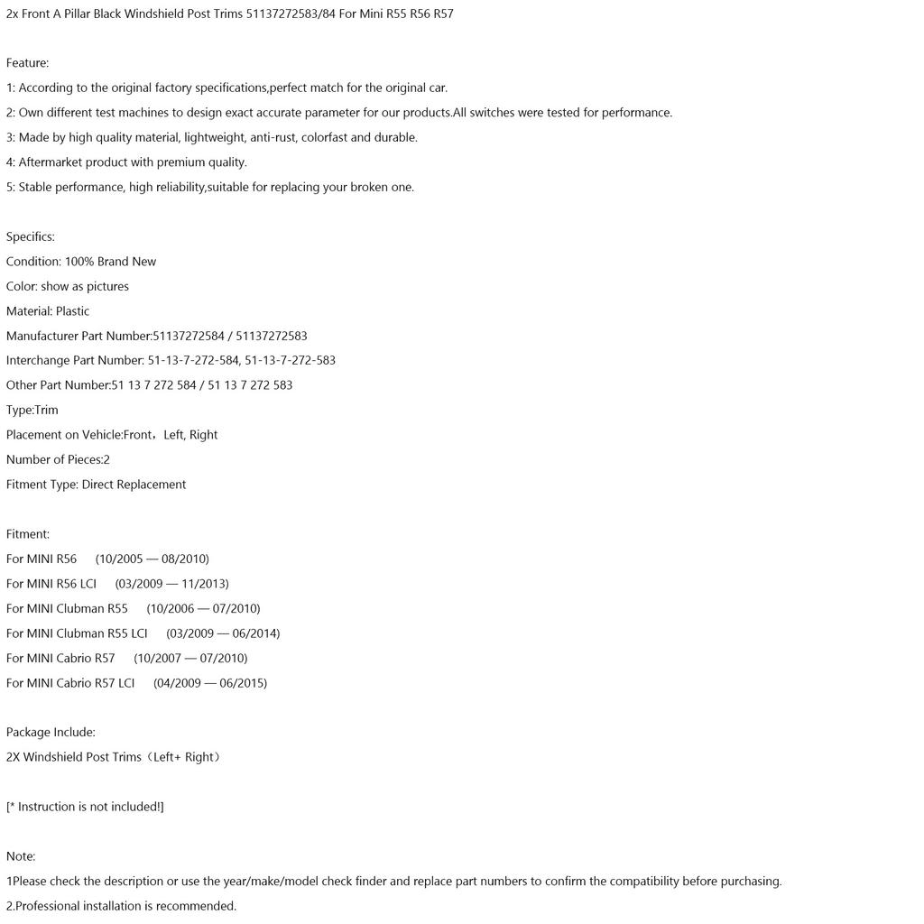 2x Передние черные накладки на стойку ветрового стекла 51137272583/84 для Mini R55 R56 R57