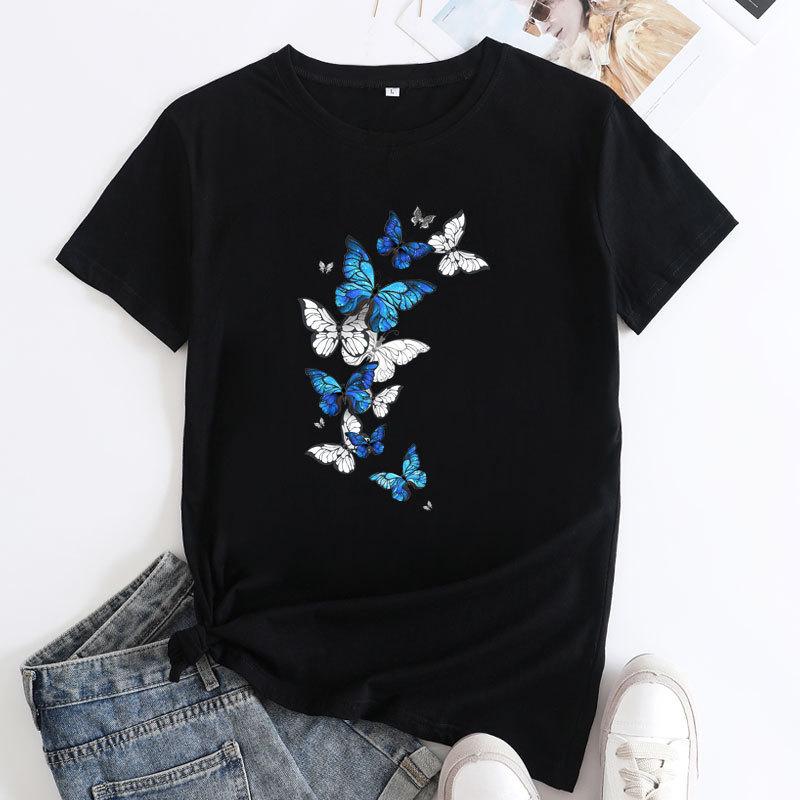 Летний топ с круглым вырезом и принтом в виде развевающихся бабочек, модные повседневные женские футболки из чистого хлопка с короткими рукавами