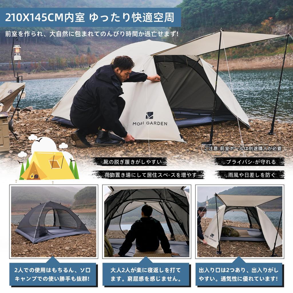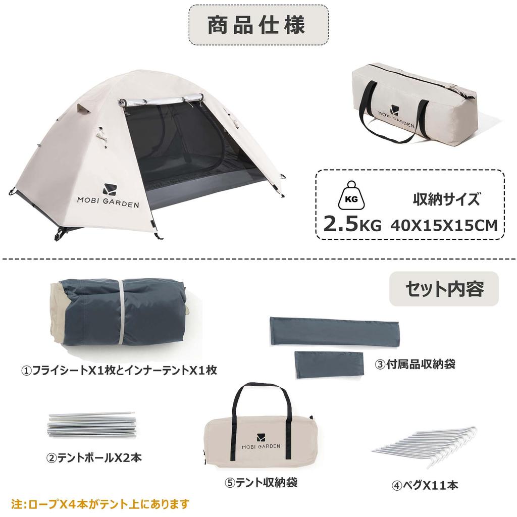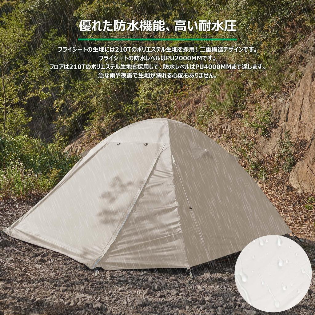 [Характеристики продукта] Размер использования: (40+140+40) x 210 x 110 см / Размер хранения: 40 х 15 х 15 см. Ширина палатки составляет 140 см, а высота потолка — 110 см, что позволяет разместиться двум людям.. Вес упаковки: около 2,5 кг. Он компактен и легко крепится к рюкзаку, поэтому его можно без труда носить с собой в течение длительного времени.. Установить содержимое: 1 тент, 1 внутренняя часть, 2 стойки для палатки, 11 колышков, 4 веревки.
