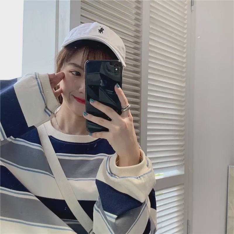 Женский хлопковый свитер в полоску в корейском стиле 2024 года — легкий, свободный крой для осени/зимы
