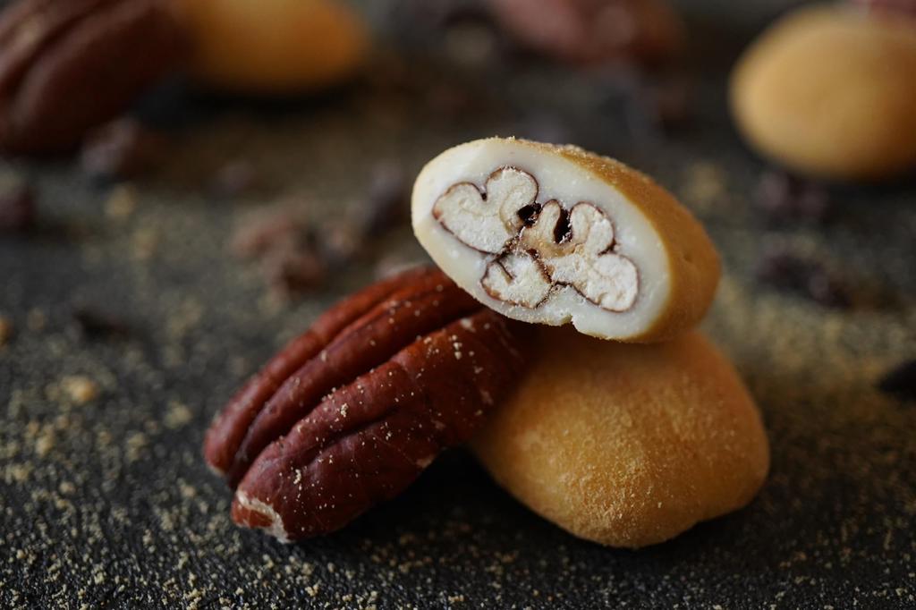 Орехи пекан в сахарной глазури покрыты сладким белым шоколадом и посыпаны нежной сладкой карамельной пудрой.