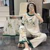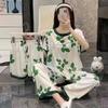 Пижама из молочного шелка женская с зелеными листьями, мультяшная, милая и очаровательная, комплект из трех предметов, женская домашняя одежда, шелк