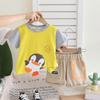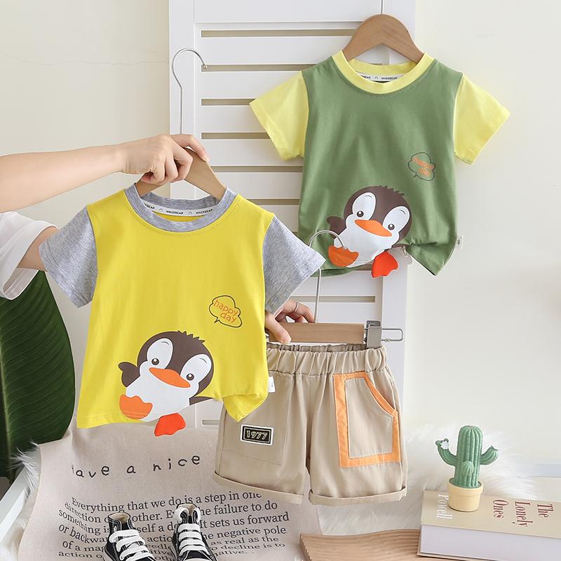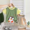 Комплект из 2 предметов из хлопка для мальчиков - Детский топ с круглым вырезом и мультяшным пингвином в стиле колор-блок + Повседневные шорты - Доступная цена Детская одежда -S-XXL