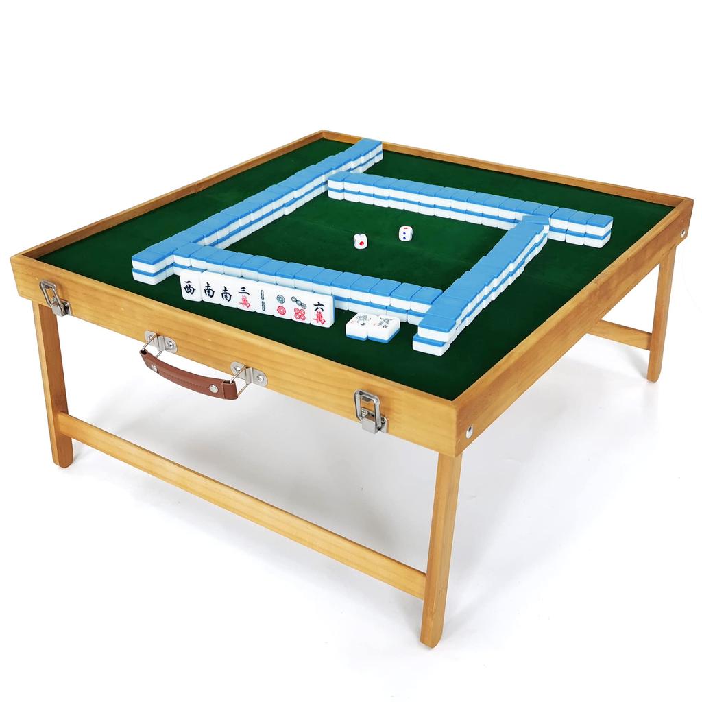 Складной стол для игры в маджонг со встроенным местом для хранения, включая ручку для переноски из полиуретана, набор из 144 плиток для игры в маджонг и деревянный ящик для хранения игрушек.. Он имеет полностью сосновый каркас с сосновыми ножками и заклепочными усилениями, а также стальные крепления для удобного хранения.
