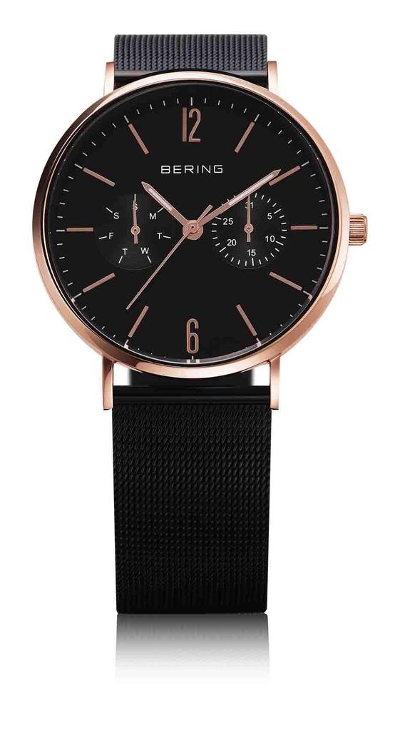 BERING Черная телячья кожа Черная нержавеющая сталь с 2 сетчатыми ремешками Розовое золото Сапфировое стекло Изменения Подлинный импортный продукт Гарантия 3 года Устойчивость к царапинам