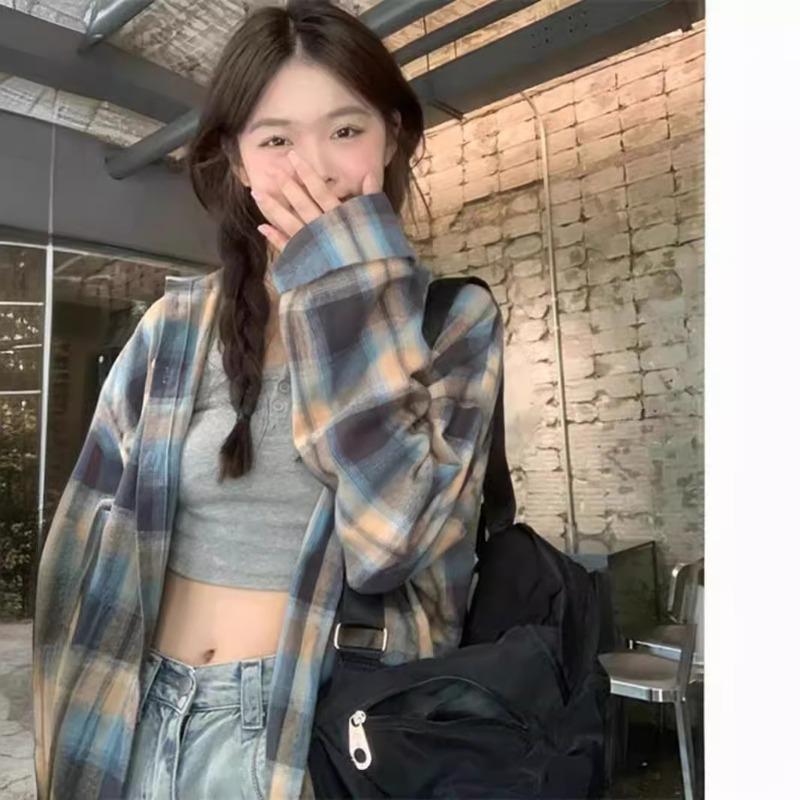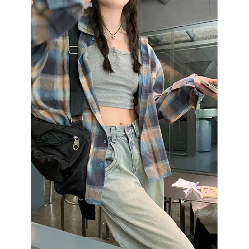 YYFS Женская мода повседневная весна осень клетчатый принт длинный рукав воротник поло блузки и рубашки