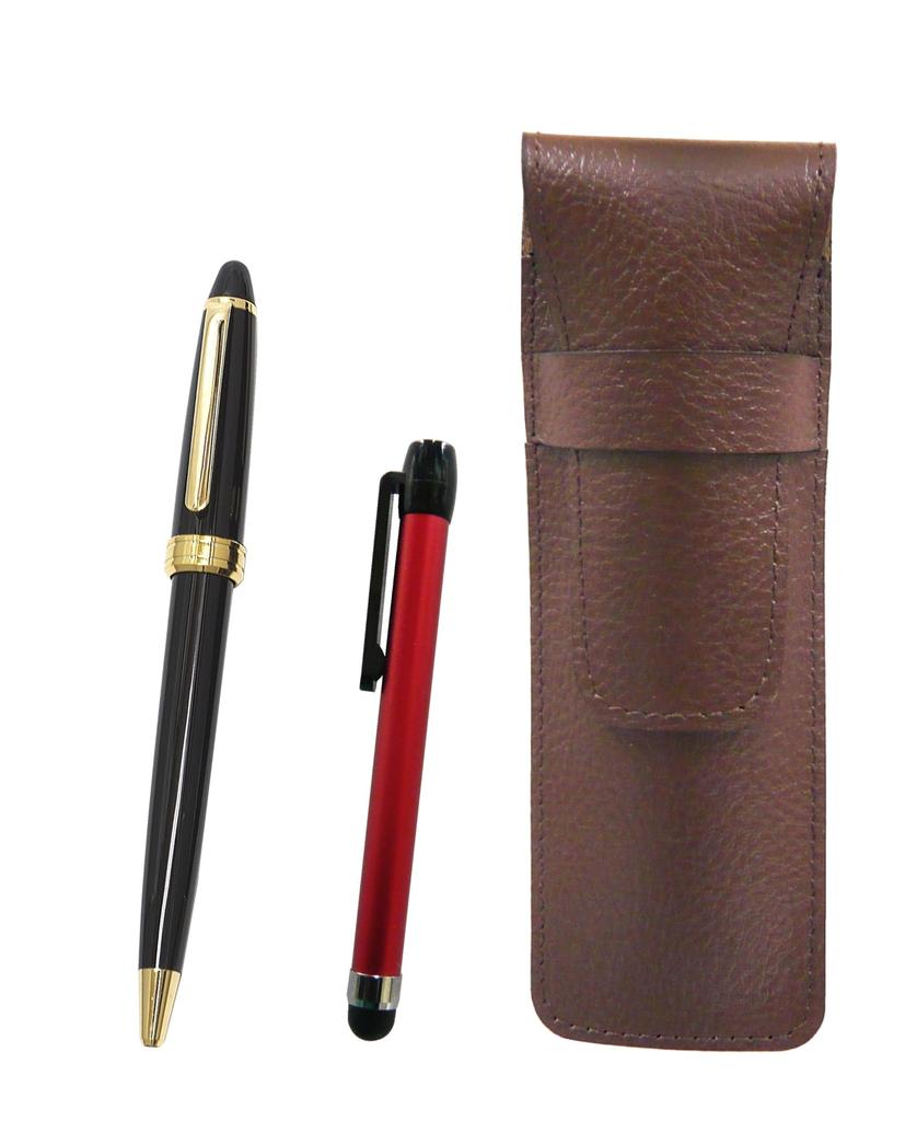 2 Pack Grained Chocolate Color Cowhide Pencil Case Metal Touch Stick Red and Neo Ballpoint Pen Set Black D-600 SASTYO-ALR-600B-B-2