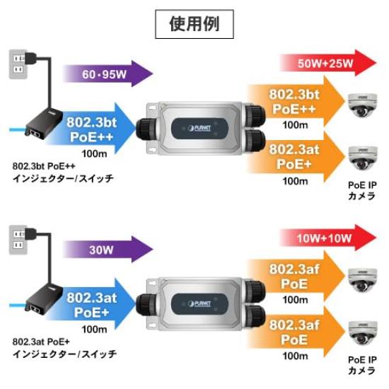 Промышленный удлинитель PoE на Gigabit PLANET-IPOE-E302 1 порт 802.3bt PoE++ 2 порта 802.3at