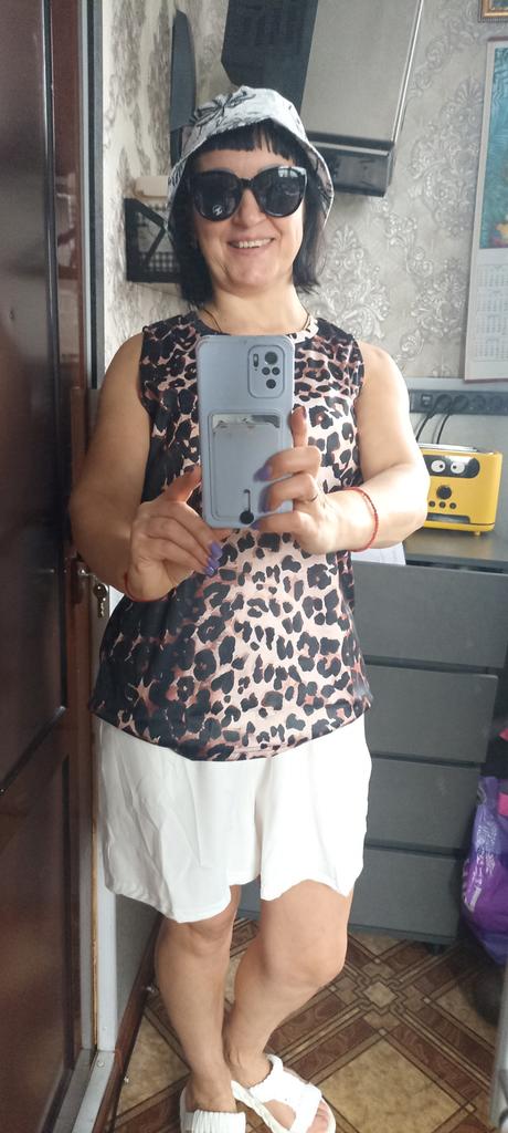 Прикольная. Как раз похудела на 5 кг-ков... иначе даже на грудь не налезла бы. Сейчас сидит идеально. Синтетика гольная....но так поиятно к телу... в общем оч.довольна. ниточки кое где торчат но не критично. Продавца рекомендую. Дополняю. Не снимала почти все лето. Очень понравилась...