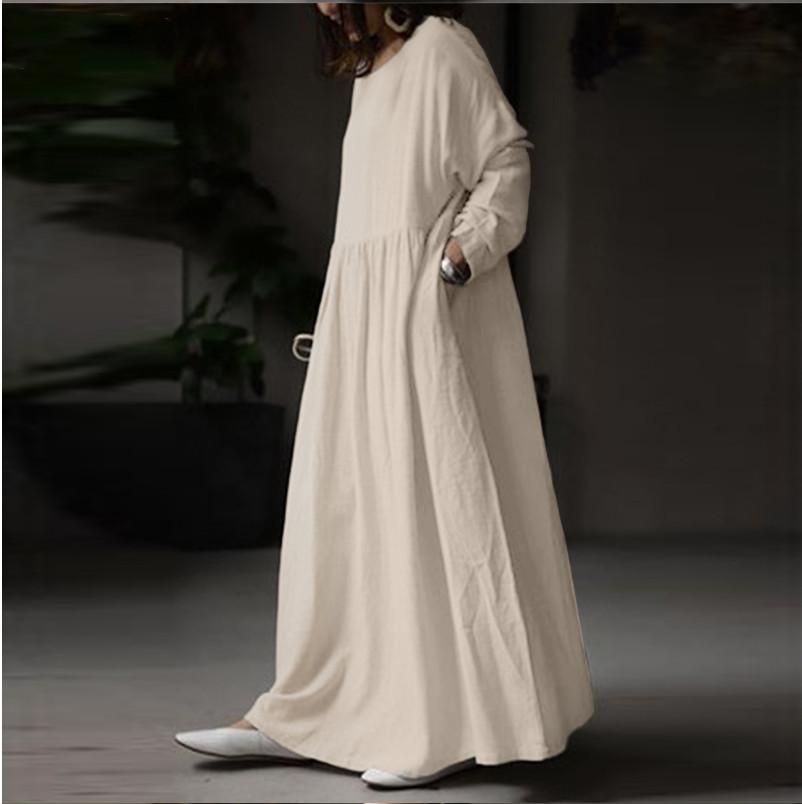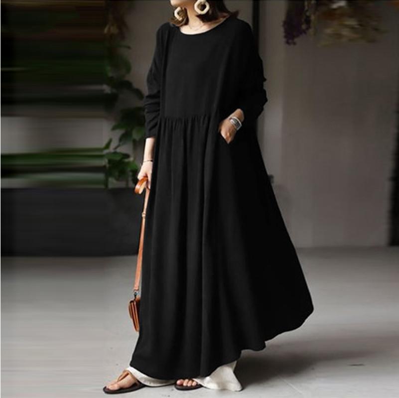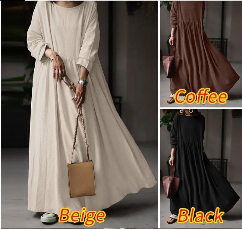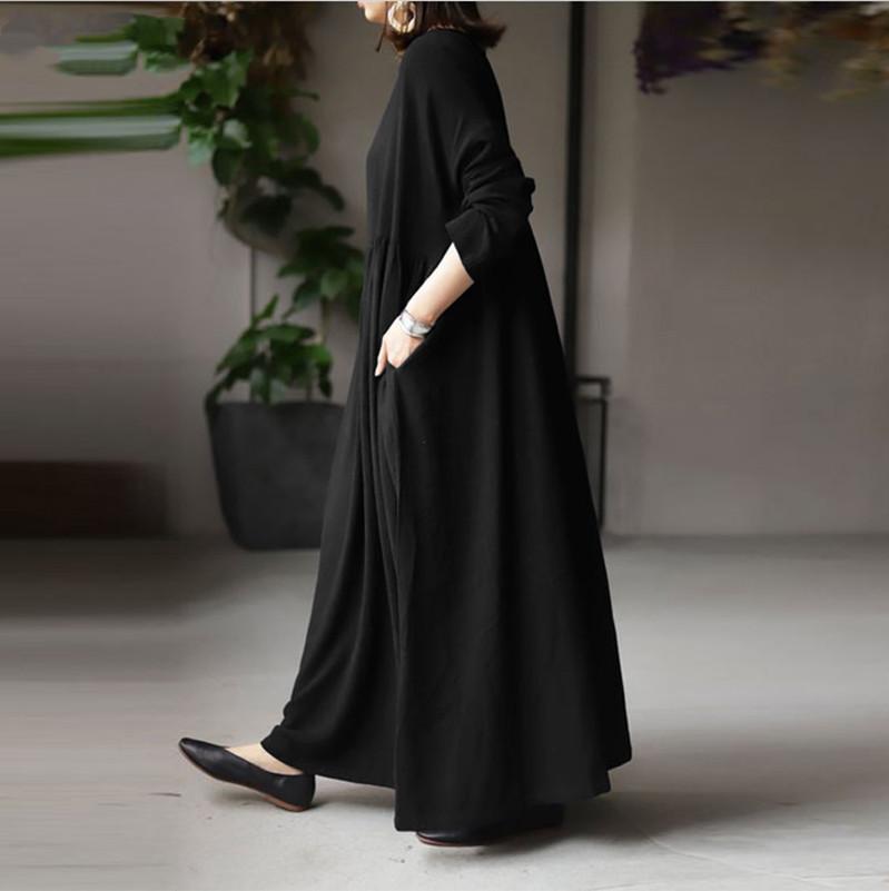 Весна Осень Женское Винтажное Однотонное Длинное Платье Женский Сарафан Повседневный Длинный Рукав Плиссированные Платья Ретро Длинное Свободное Платье