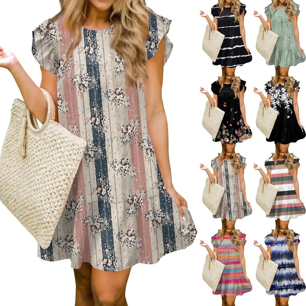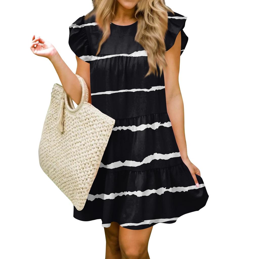 Женская мода лето повседневный О-образный вырез рукав оборки без рукавов струящаяся короткая туника платье