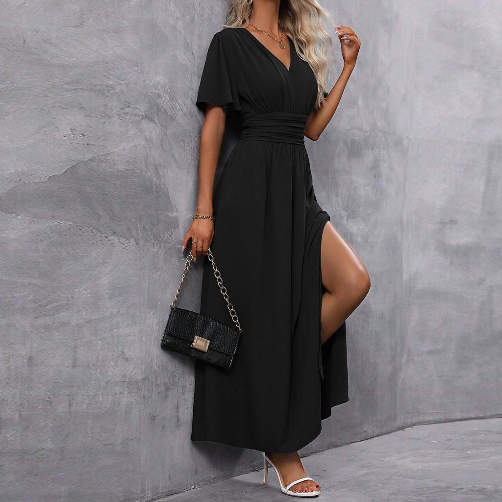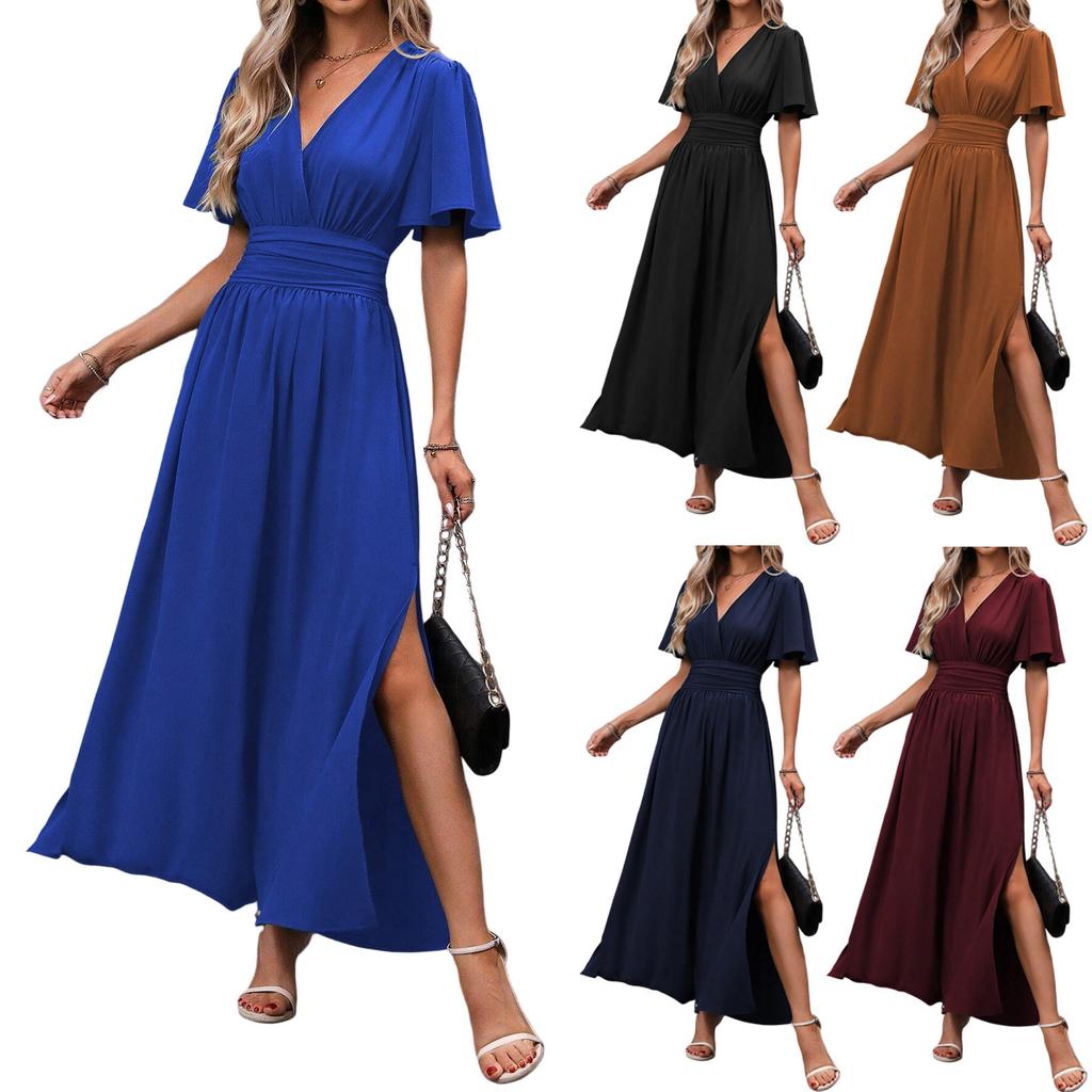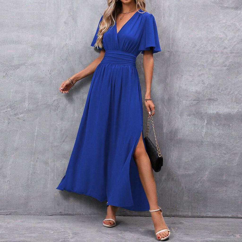 Женское модное однотонное платье с V-образным вырезом, элегантное, с короткими рукавами, завязывающееся на талии, с высоким разрезом, длинное платье