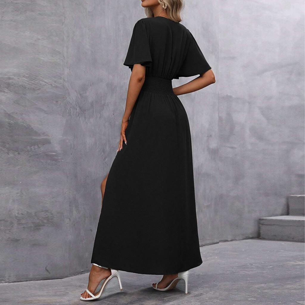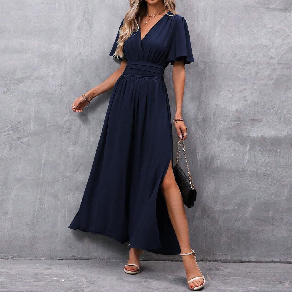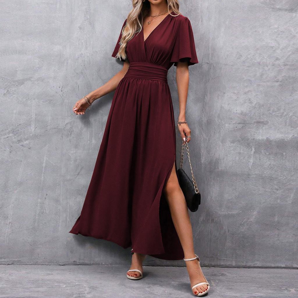 Женское модное однотонное платье с V-образным вырезом, элегантное, с короткими рукавами, завязывающееся на талии, с высоким разрезом, длинное платье
