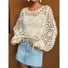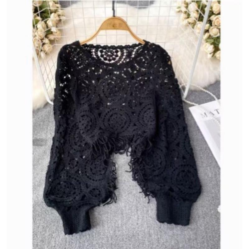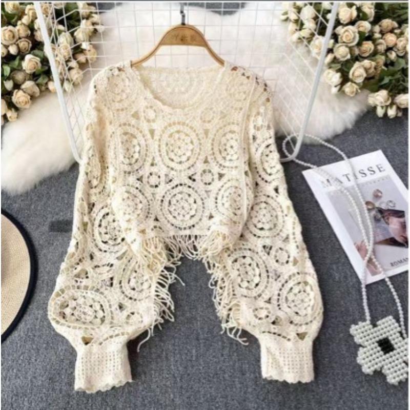 Весна-лето женская блузка с круглым вырезом, вязанная крючком, новая мода, укороченный топ с длинным рукавом, пуловер, трикотажная блузка, женская повседневная блузка 3408