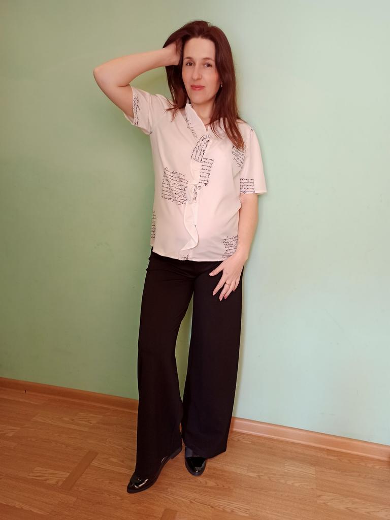 Блузка отличная, шла чуть больше месяца, это ещё учитывая праздники. Ещё не гладила, ношу 46-48, взяла L, кто любит оверсайз надо брать на размер больше. Я довольна.