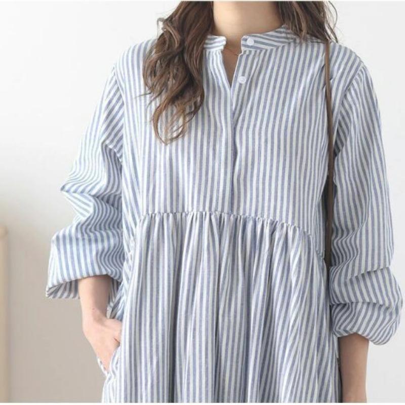 Женское раннее осеннее длинное полосатое однобортное платье свободного кроя с круглым вырезом выше колена