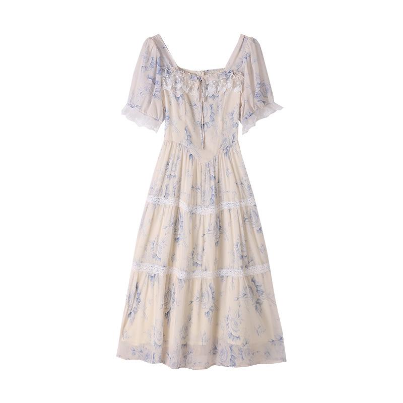 Плюс Размер Женское Летнее Высококачественное Стильное Винтажное Квадратный Воротник Рукава Сумка Цветочное Платье