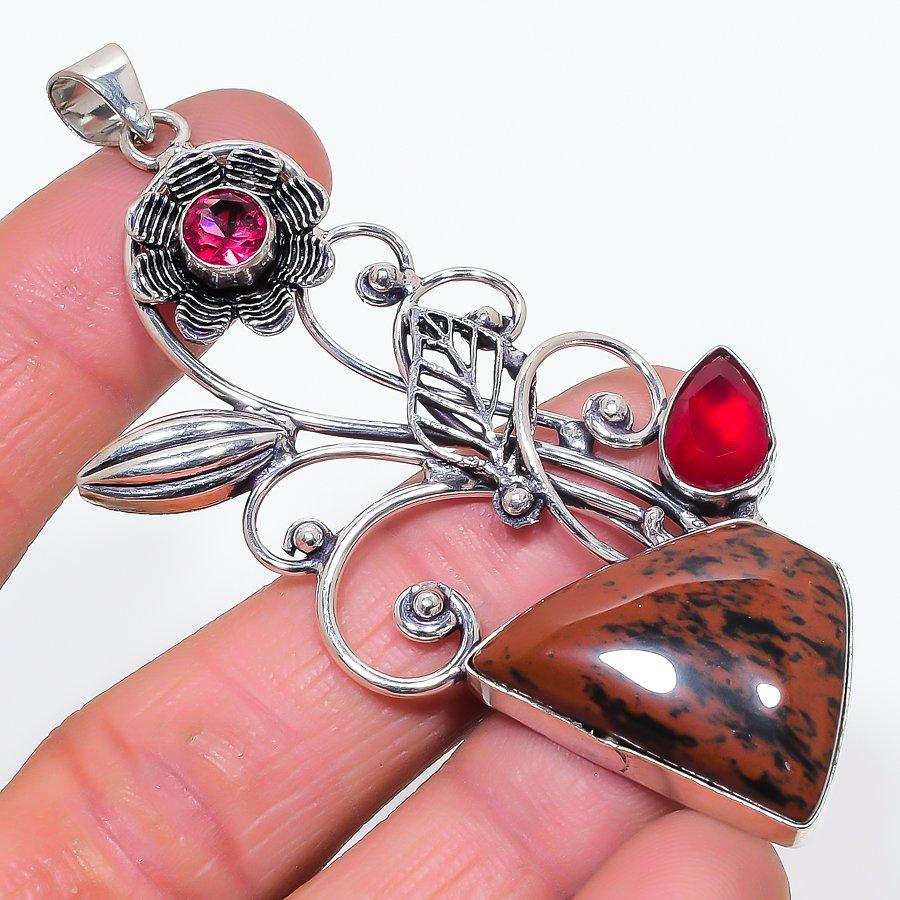 Махагоновый обсидиан, гранат Ручная работа Подвеска из серебра 925 пробы 3,47" w3V52