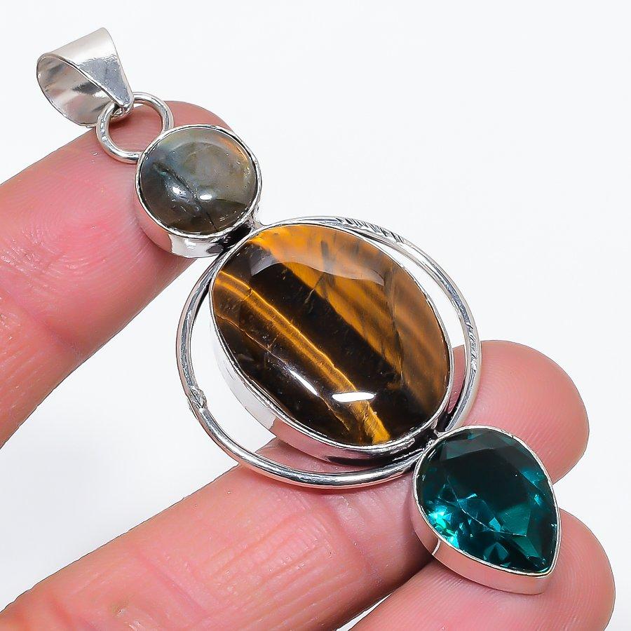 Тигровый глаз, Голубой топаз Ручная работа Ювелирная подвеска из стерлингового серебра 925 пробы 2,96"